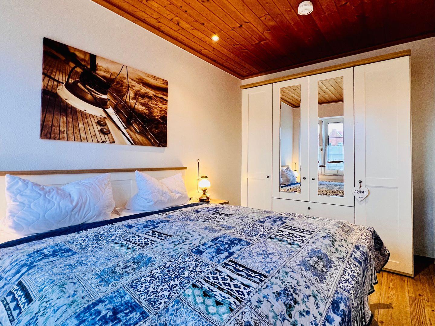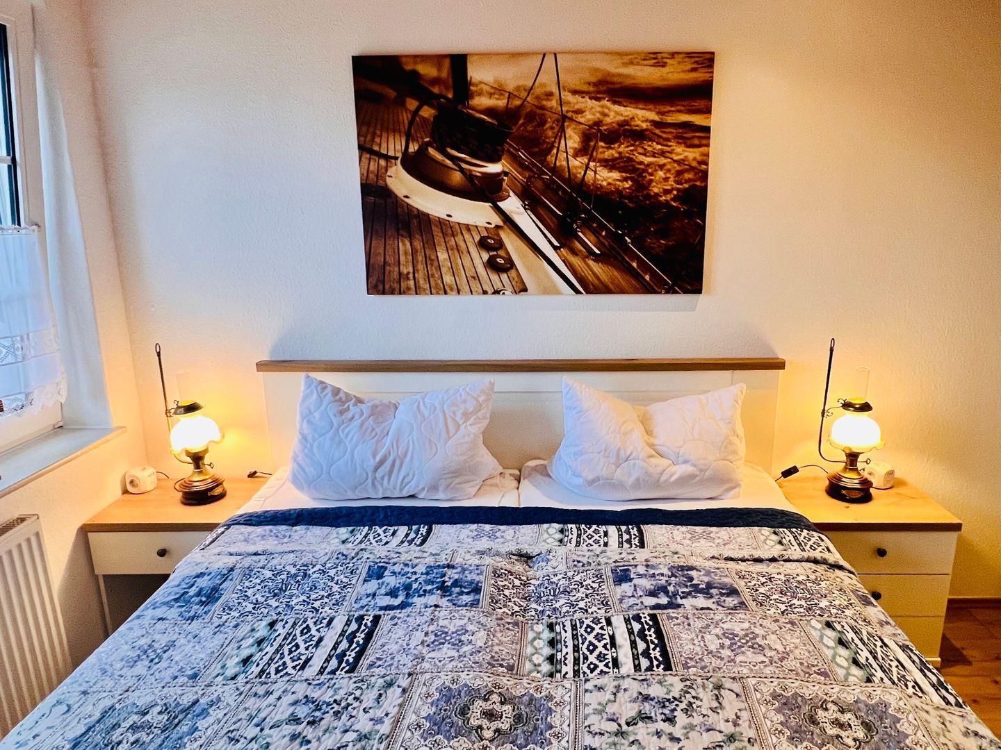 Kajüte: Gemütlich von Seemannsgarn träumen. Unser Doppelbett verspricht einen erholsamen Schlaf. Elektrische Rollläden sind vorhanden.