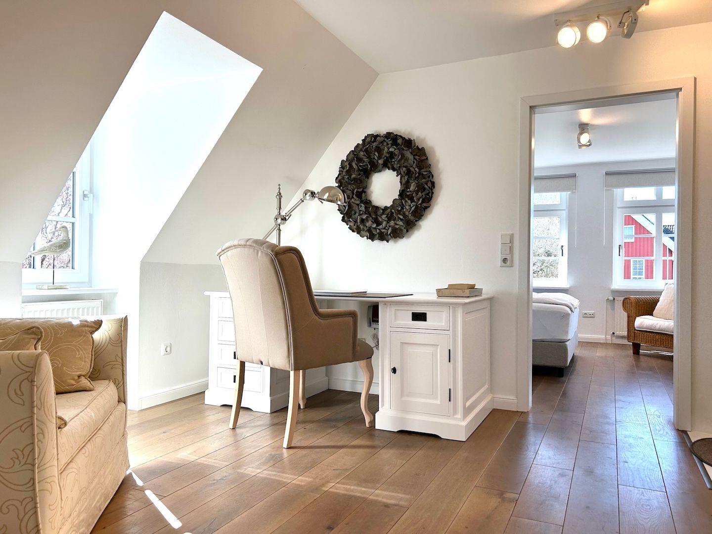 Das Herzstück des Hauses bildet das Erdgeschoss mit einem einladenden Wohn- und Esszimmer mit handgeformten französischen Bodenfliesen. Hier können Sie zu zweit oder im Kreise Ihrer Lieben gemütliche Stunden verbringen. Ein elegantes Villeroy & Boch-Badezimmer findet sich hier genauso wie eine separate voll ausgestatteten Küche mit kleinem Esstisch und ein kleines Schlafzimmer mit Einzelbett - das Kapitänszimmer.