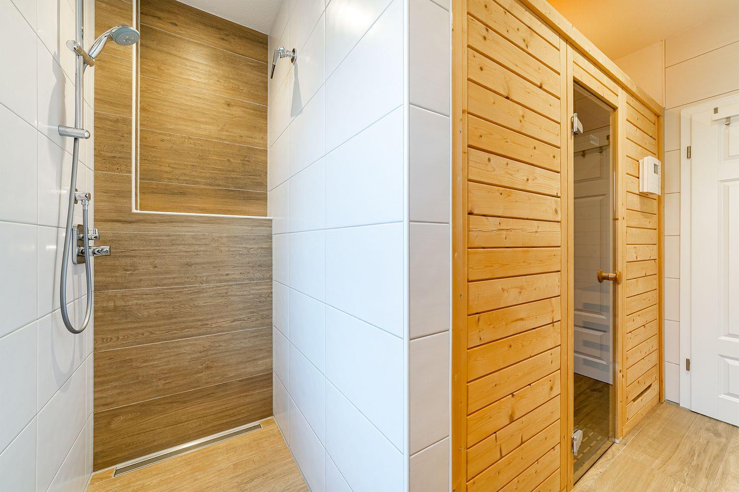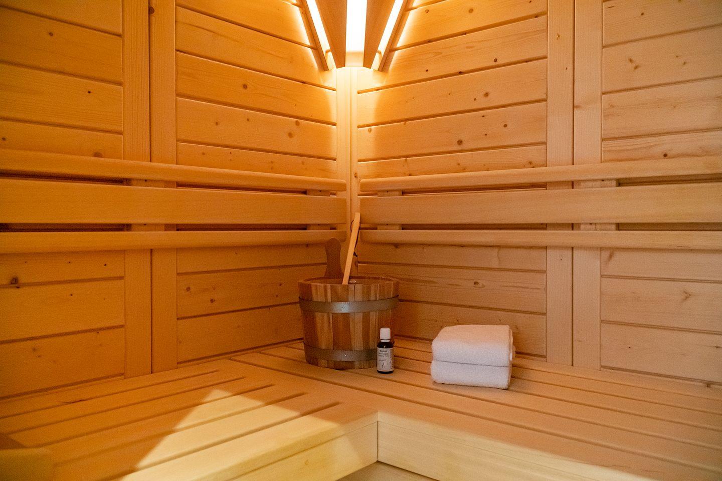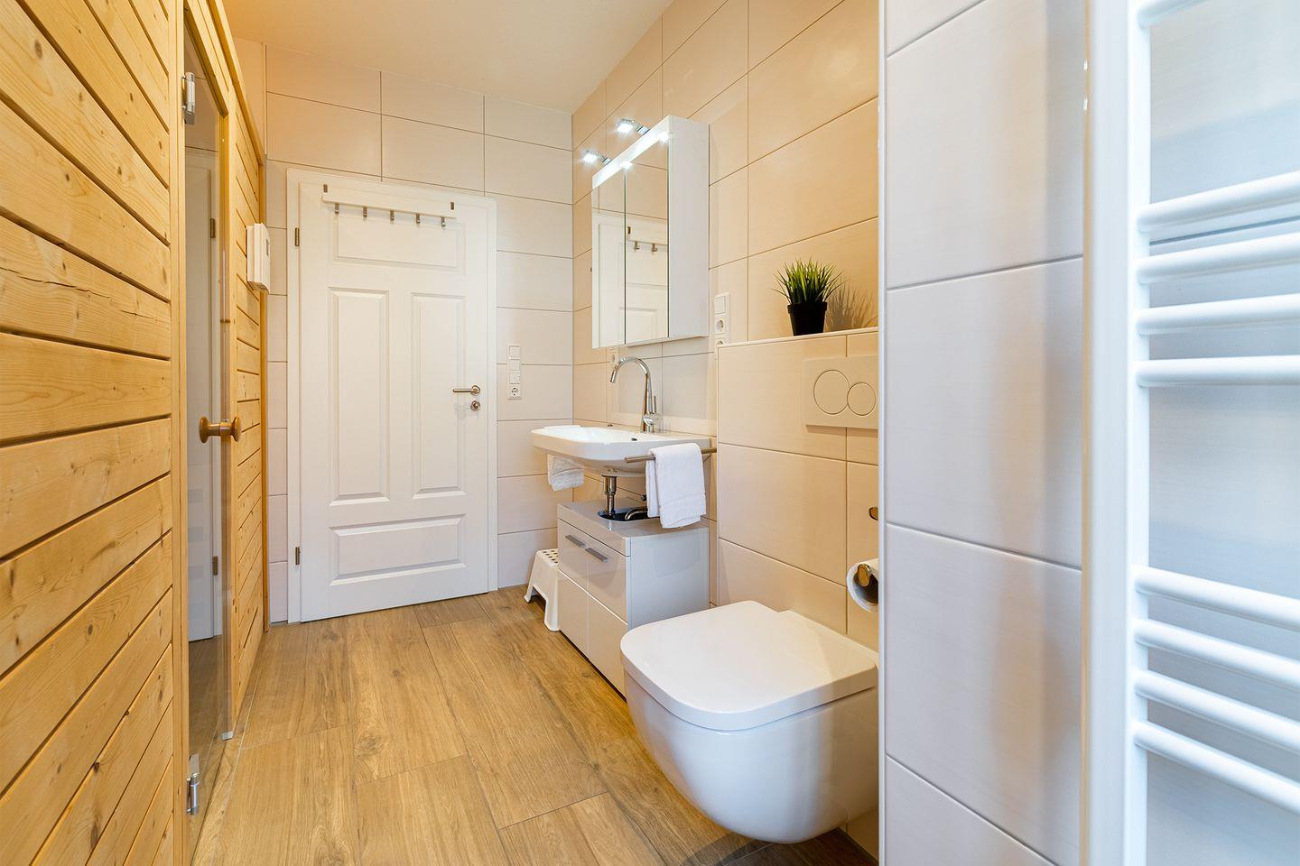 Das Badezimmer bietet eine große Walk-In Dusche mit Schwalldusche, ideal für Saunaliebhaber. Passende Saunaaufgüsse stehen vor Ort bereit (gegen Gebühr)