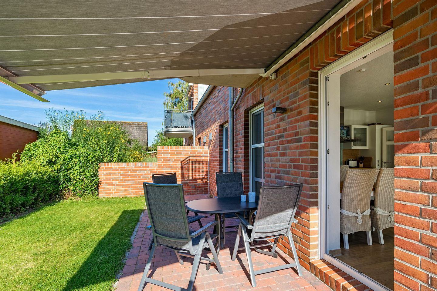 Eine schöne Terrasse mit elektrischer Markise und Gartenmöbeln