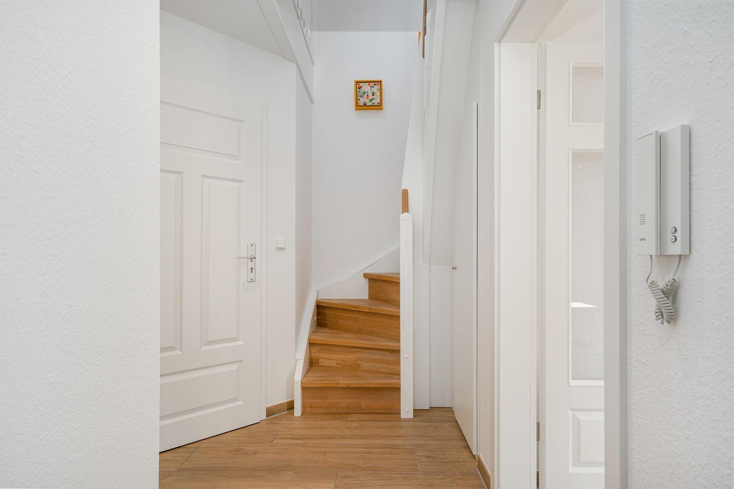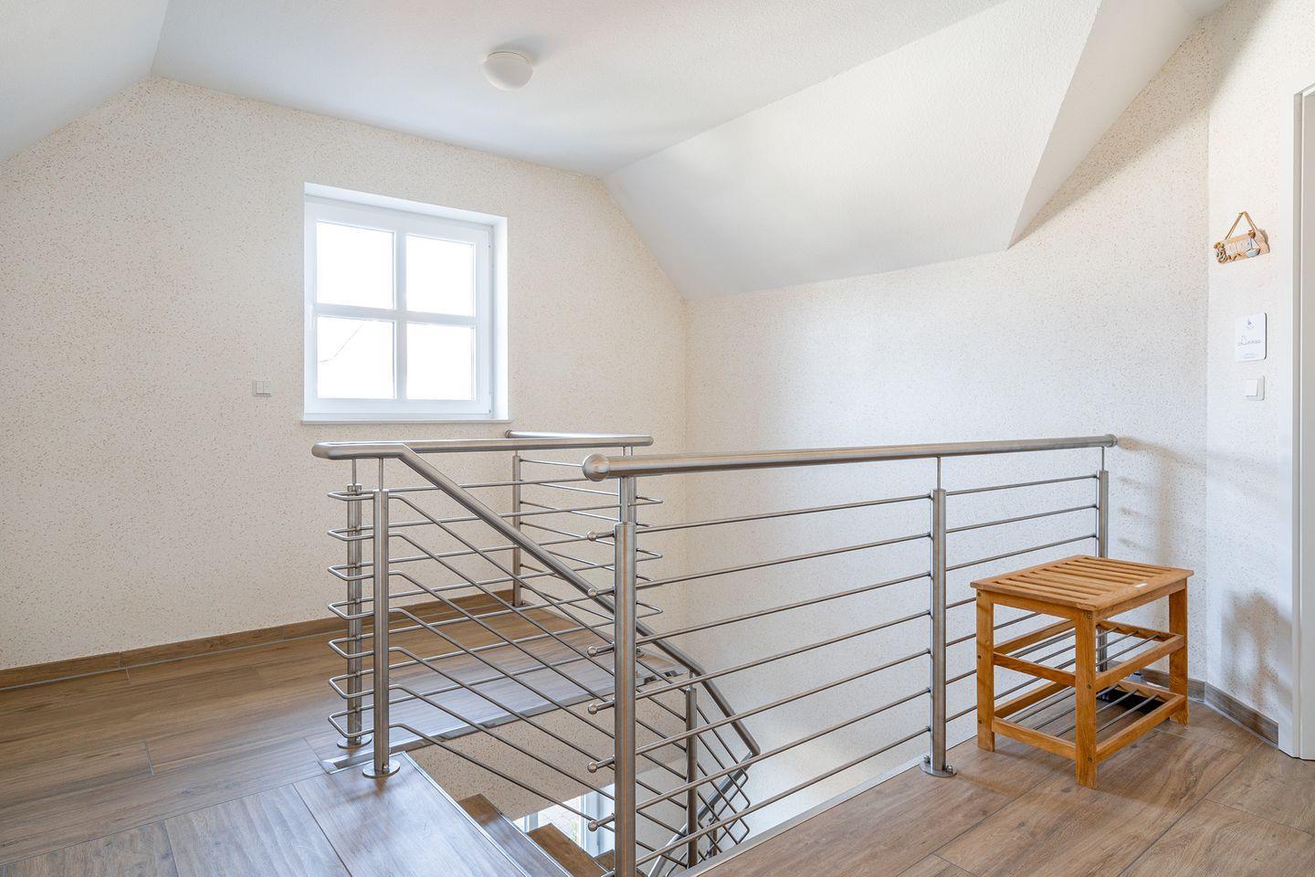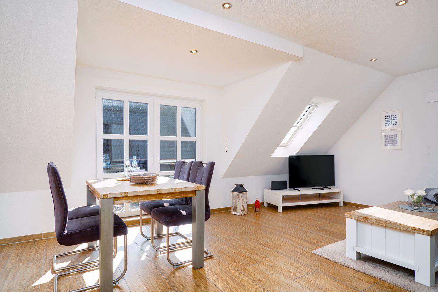 Über eine Treppe gelangen Sie in das Studio im Dachgeschoss. In diesem hellen lichtdurchfluteten Raum steht ein lederbezogener Relax-Chair und ein UHD-LED-TV zum "Chillen" für Sie bereit.