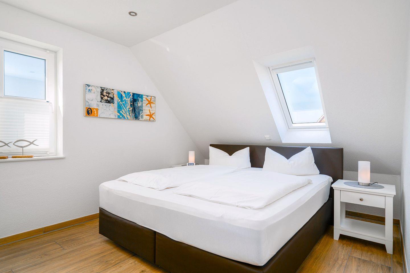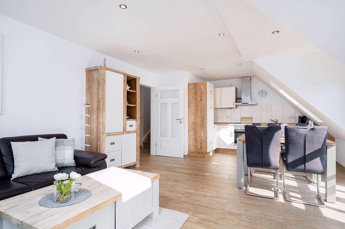 In der Nähe des Hafens und der Ortsmitte befindet sich in einer ruhigen Lage am Ende einer Sackgasse unsere 2016 neu erbaute OG-Ferienwohnung. Sie verfügt über 1 Schlafzimmer, 1 Wohnzimmer mit offenem Ess-/Küchenbereich sowie 1 Duschbad. Vor dem Ferienhaus befindet sich ein für Sie reservierter PKW-Einstellplatz. In einem eigens dafür vorgesehenen Abstellraum halten wir Ihnen zwei Stellplätze für Ihre Fahrräder frei.