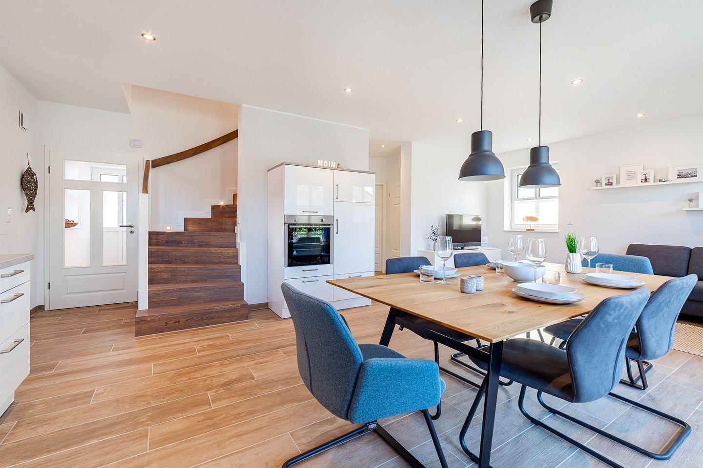 Ein großer Wohn- und Essbereich mit einer umfangreich ausgestatteten Küche bildet den Mittelpunkt des Hauses.
