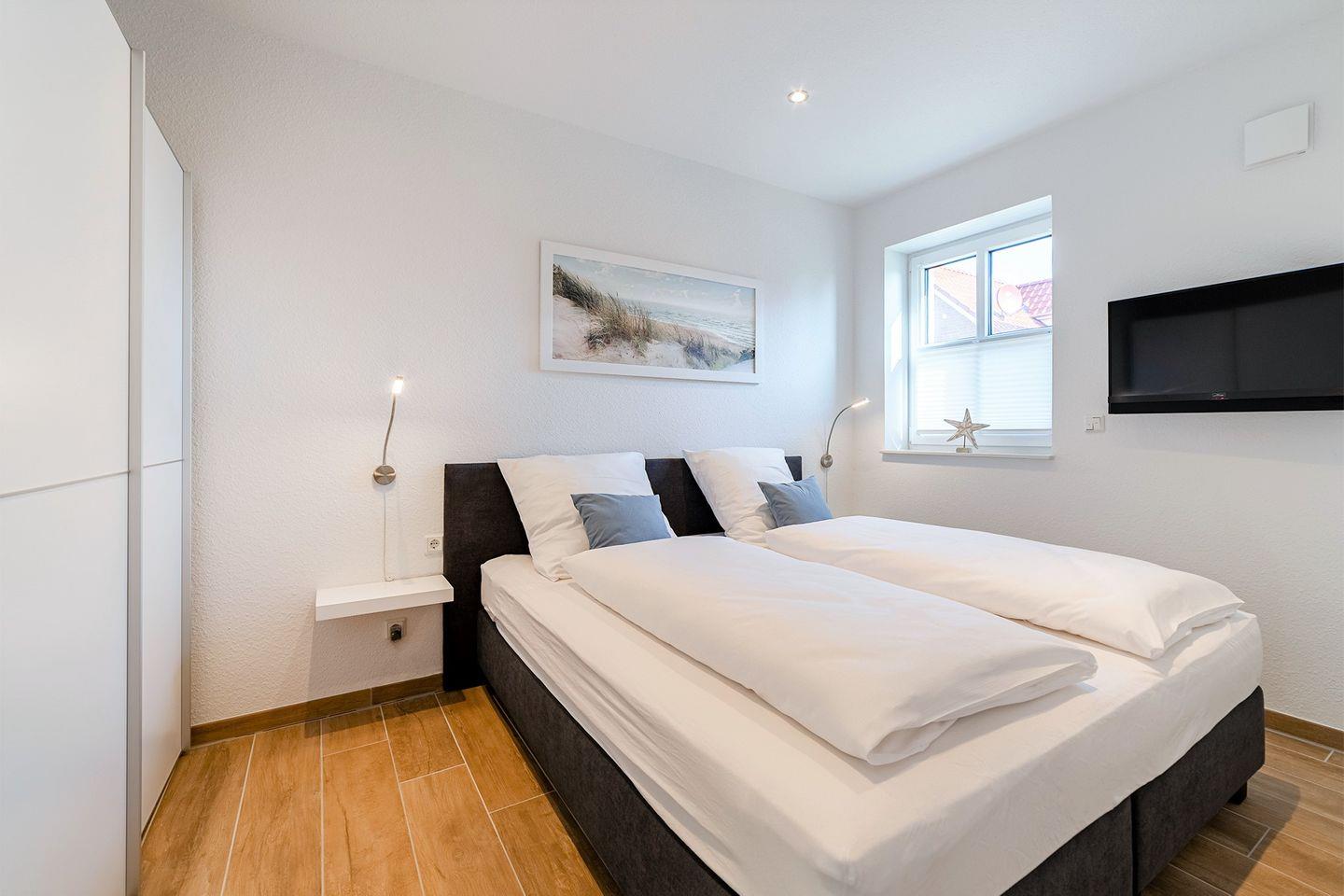 Schlafzimmer mit Boxspringbett (180x200 cm) und TV im EG