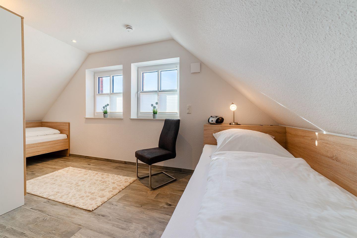 Schlafzimmer 2: Zwei Einzelbetten (je 100x200cm) im Obergeschoss.