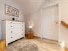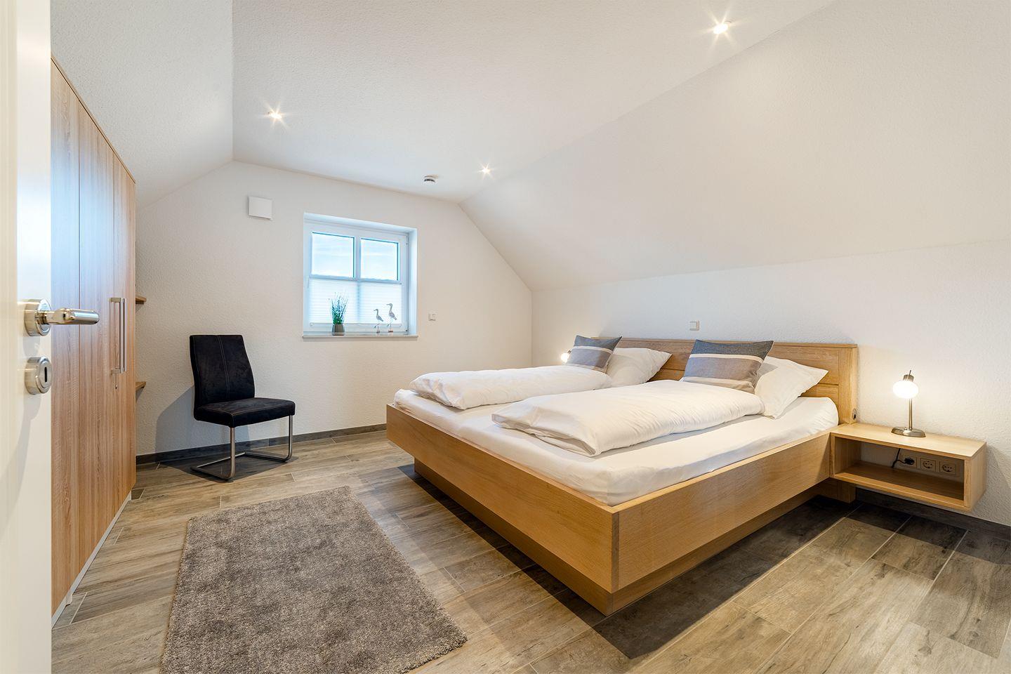 Schlafzimmer 1: Doppelbett (200x200cm) und TV im Obergeschoss.