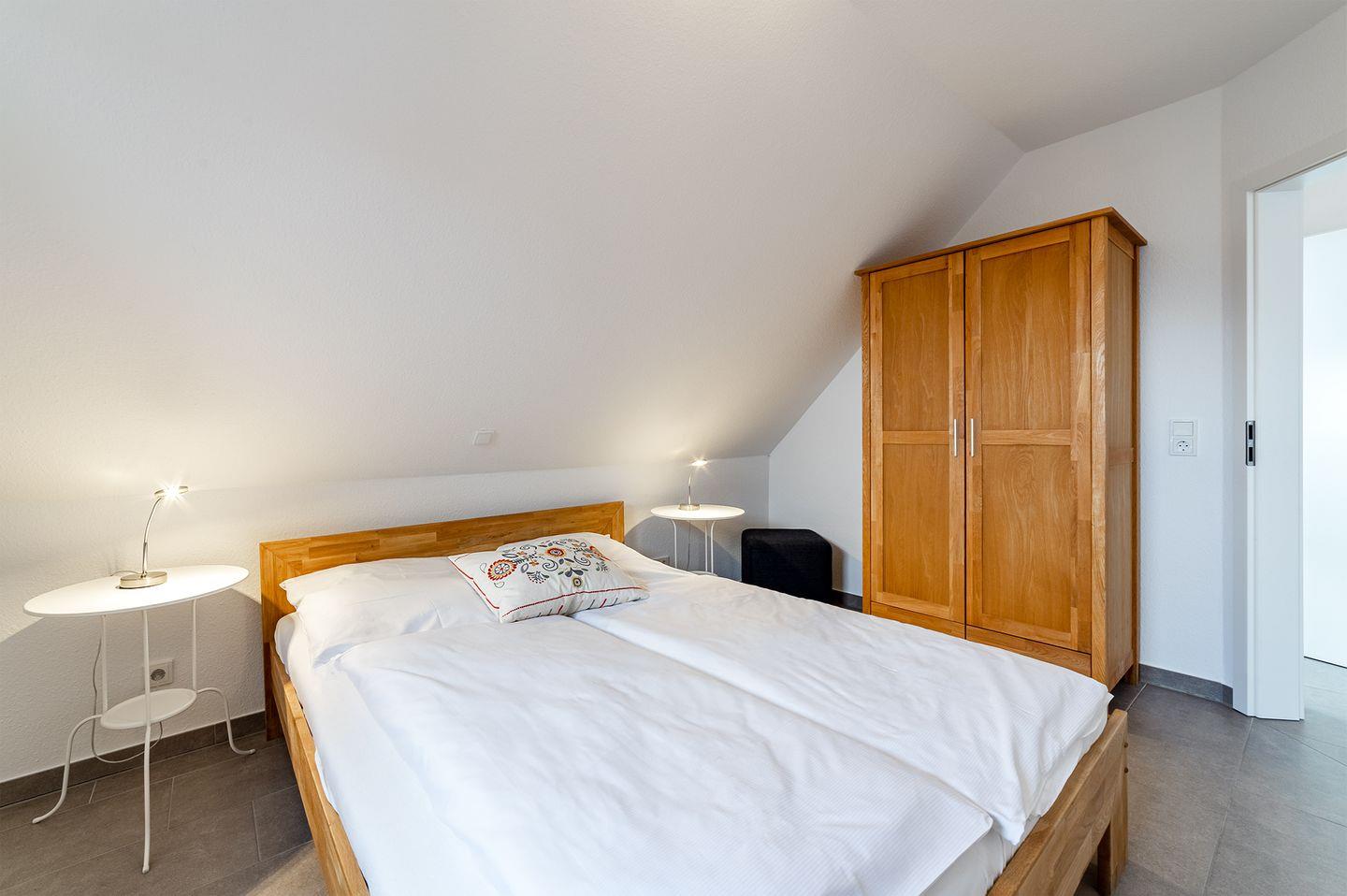 Das Schlafzimmer ist mit einem bequemen Doppelbett ausgestattet und bietet eine Verdunkelungsmöglichkeit.