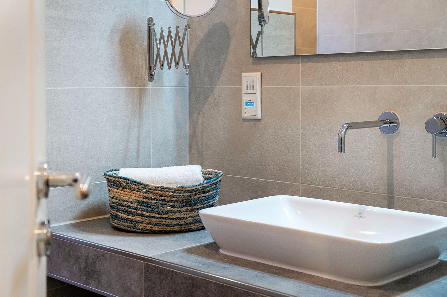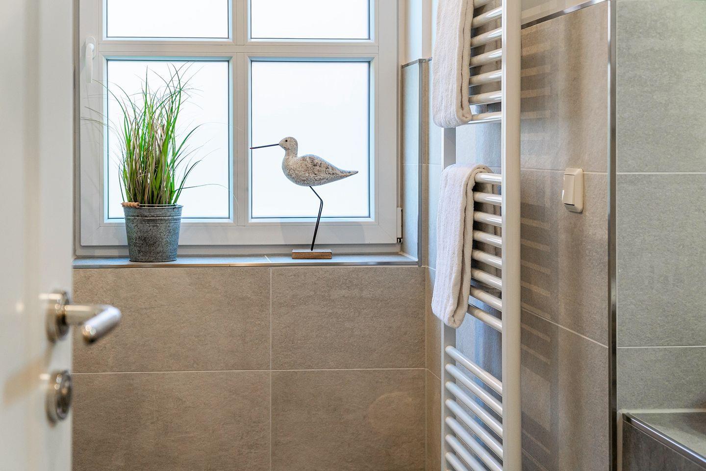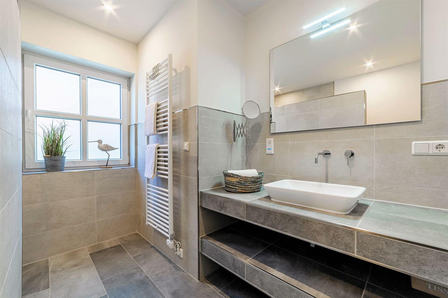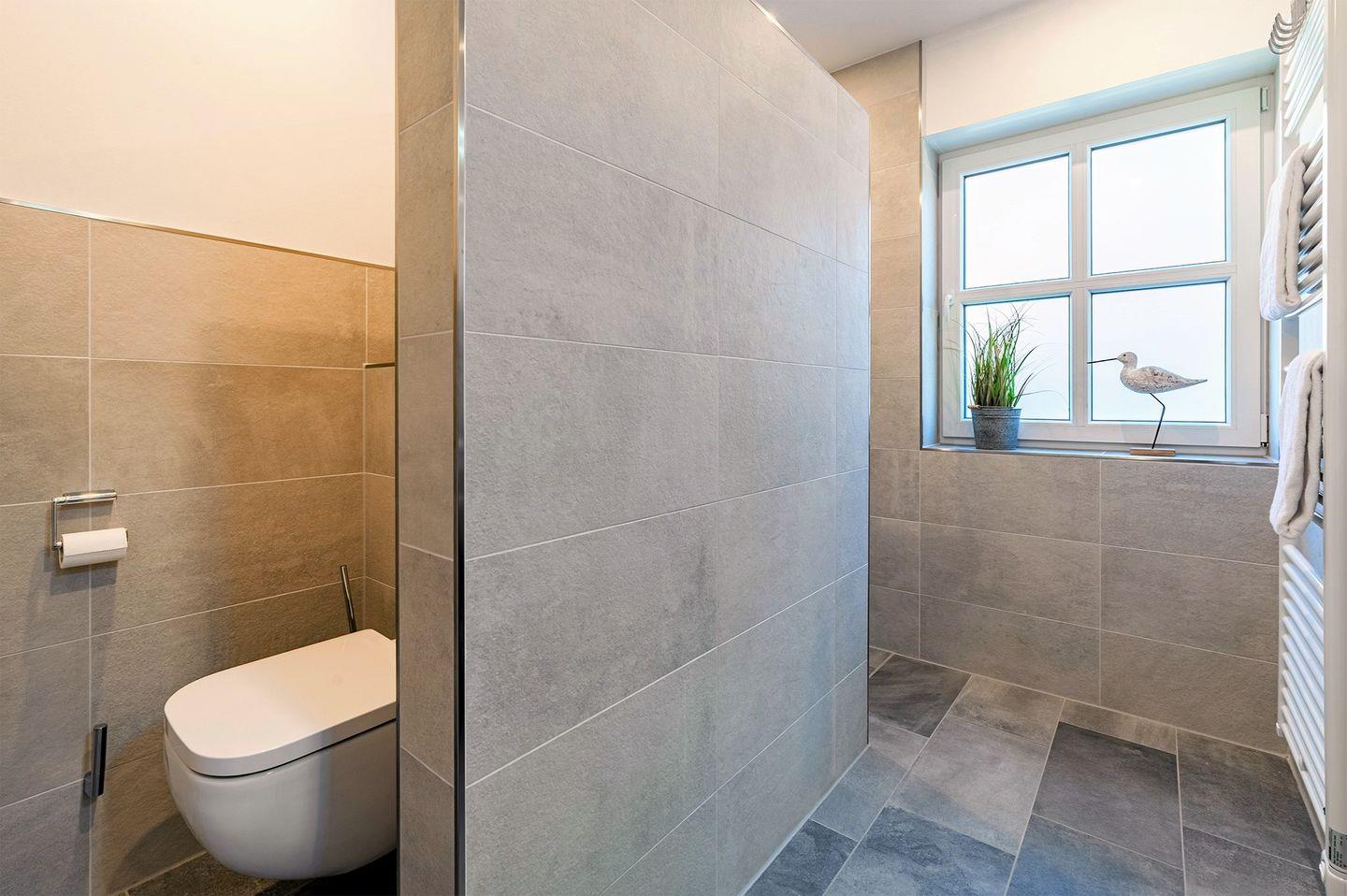 Das Badezimmer ist mit einer ebenerdigen Dusche und WC ausgestattet und bietet Ihnen modernen Komfort.