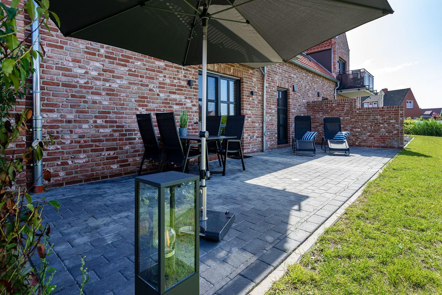 Genießen Sie entspannte Stunden auf der Terrasse, die mit einer Sitzgruppe, zwei Sonnenliegen und einem Sonnenschirm ausgestattet ist.