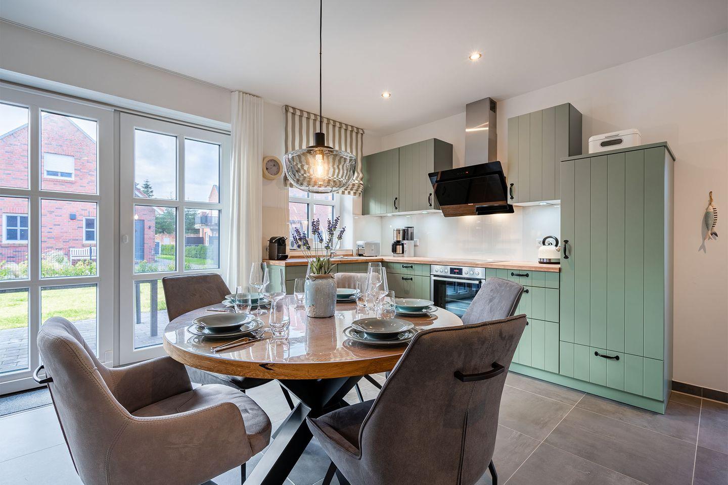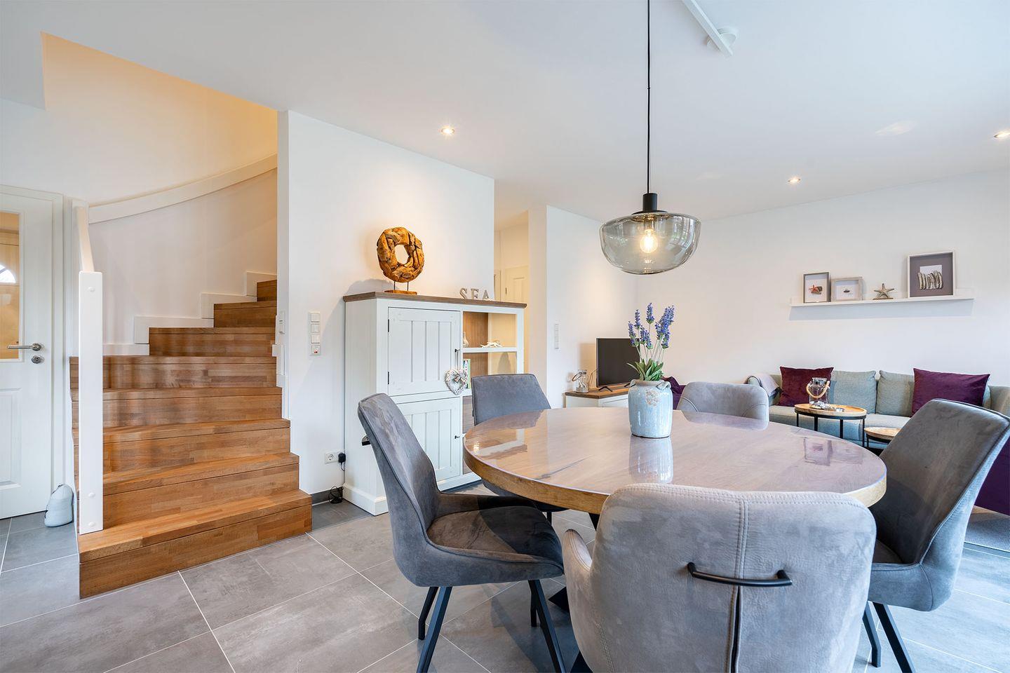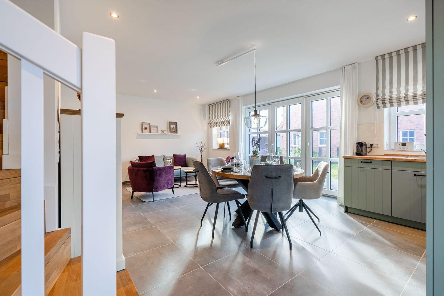 Der Wohn- und Essbereich bildet den Mittelpunkt des Hauses und sorgt mit seiner Landhausküche für gemütliche Stunden. Der Raum ist großzügig geschnitten und ideal, um gemeinsam zu kochen, zu essen und zu entspannen.