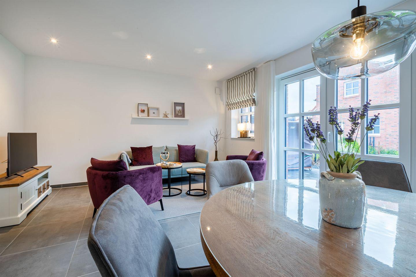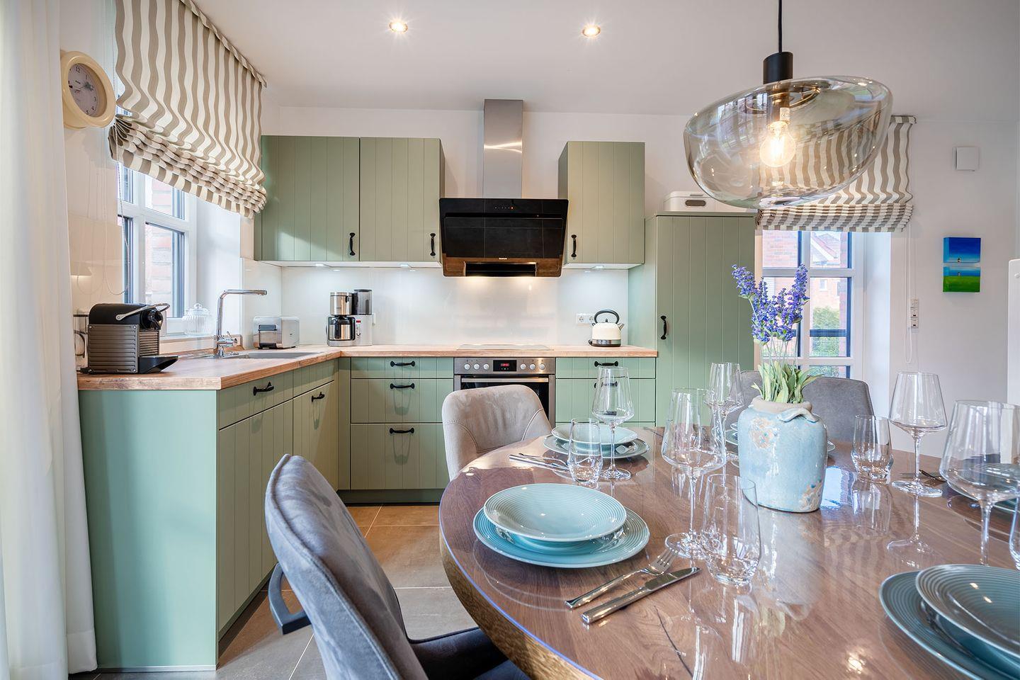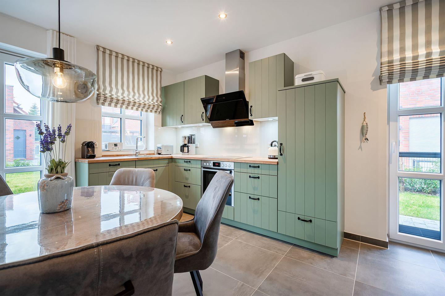 Der Wohn- und Essbereich bildet den Mittelpunkt des Hauses und sorgt mit seiner Landhausküche für gemütliche Stunden. Der Raum ist großzügig geschnitten und ideal, um gemeinsam zu kochen, zu essen und zu entspannen.