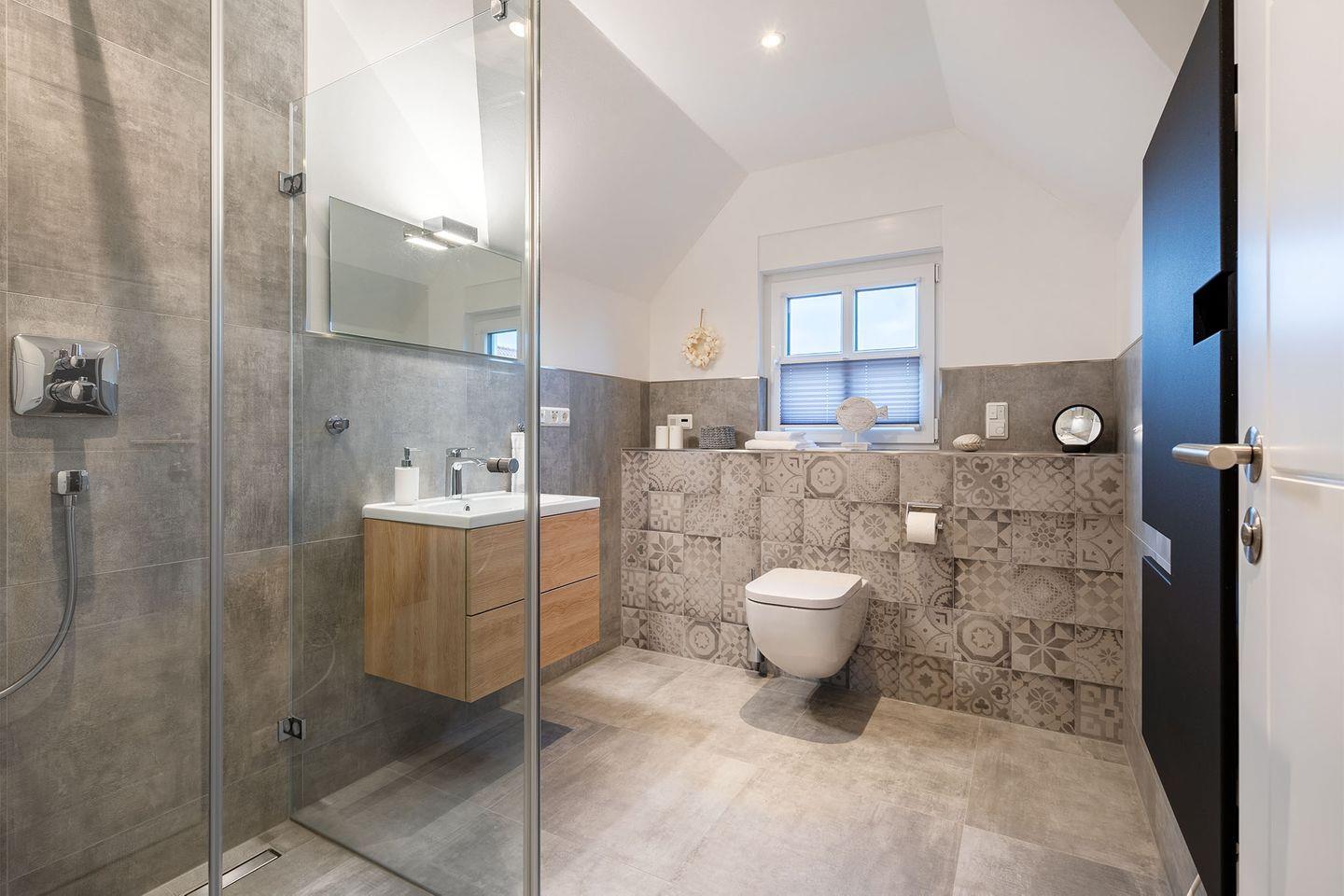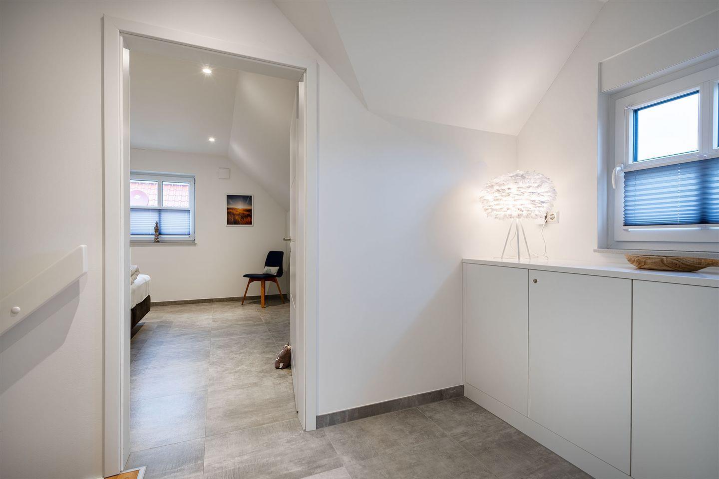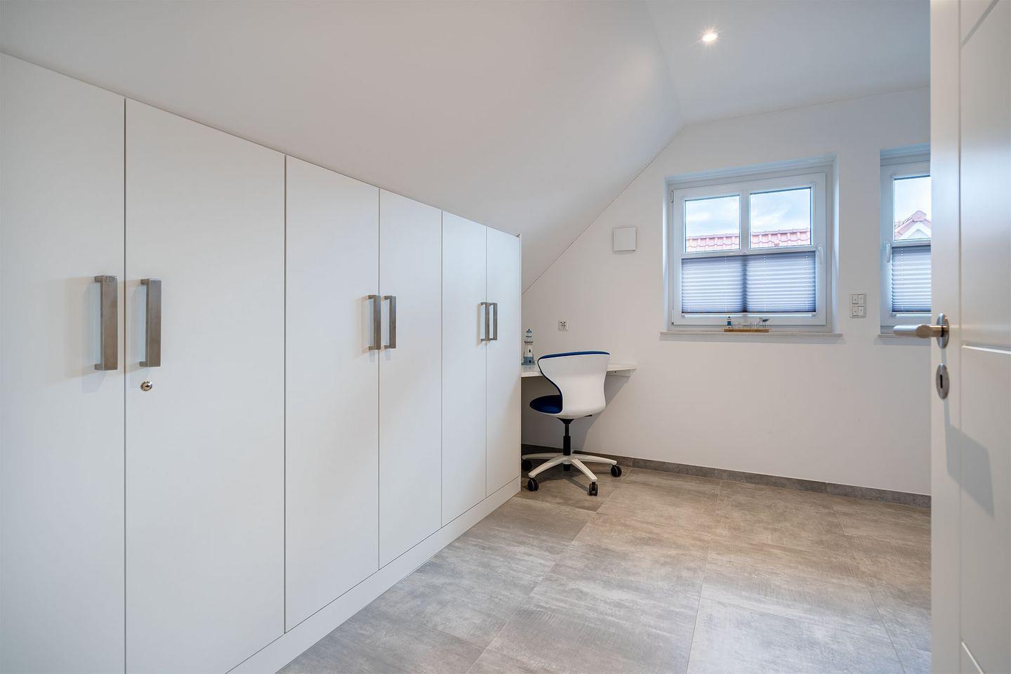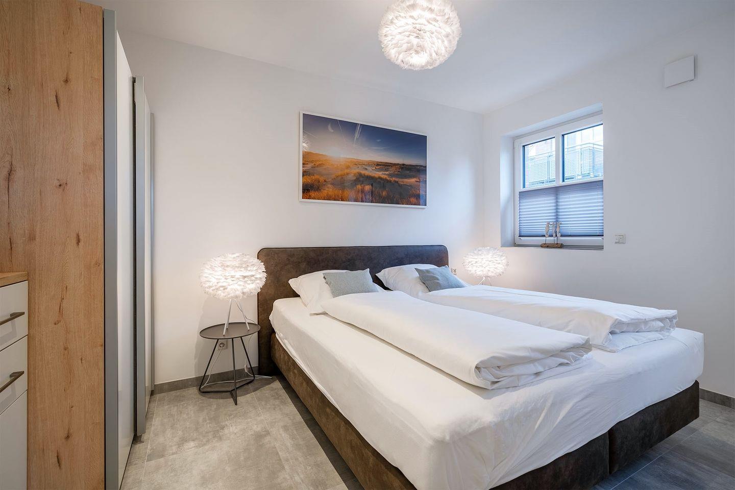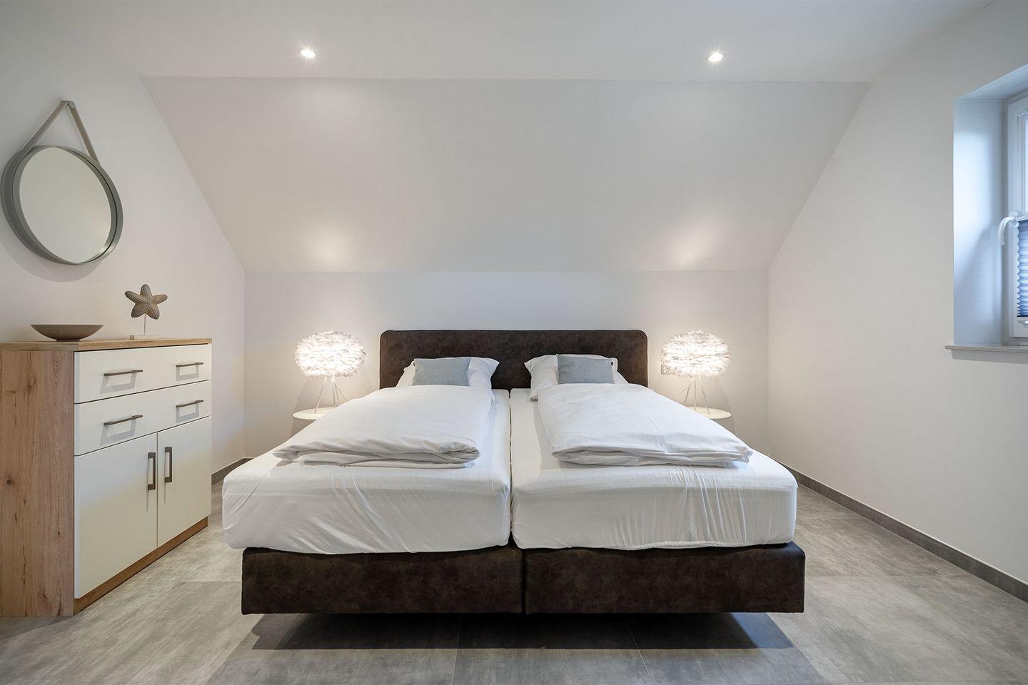 Es gibt zwei Schlafzimmer, beide ausgestattet mit Boxspringbetten, die für einen erholsamen Schlaf sorgen. Ein Schlafraum im Erdgeschoss bietet zusätzlich ein eigenes Badezimmer mit bodengleicher Dusche und abgetrenntem WC – ideal für eine private Wellness-Oase. Im Obergeschoss finden Sie ein weiteres Schlafzimmer sowie ein weiteres, komfortables Bad. Für zusätzliche Gäste oder Kinder gibt es ein Zimmer mit Schreibtisch und einem Schlafsofa.