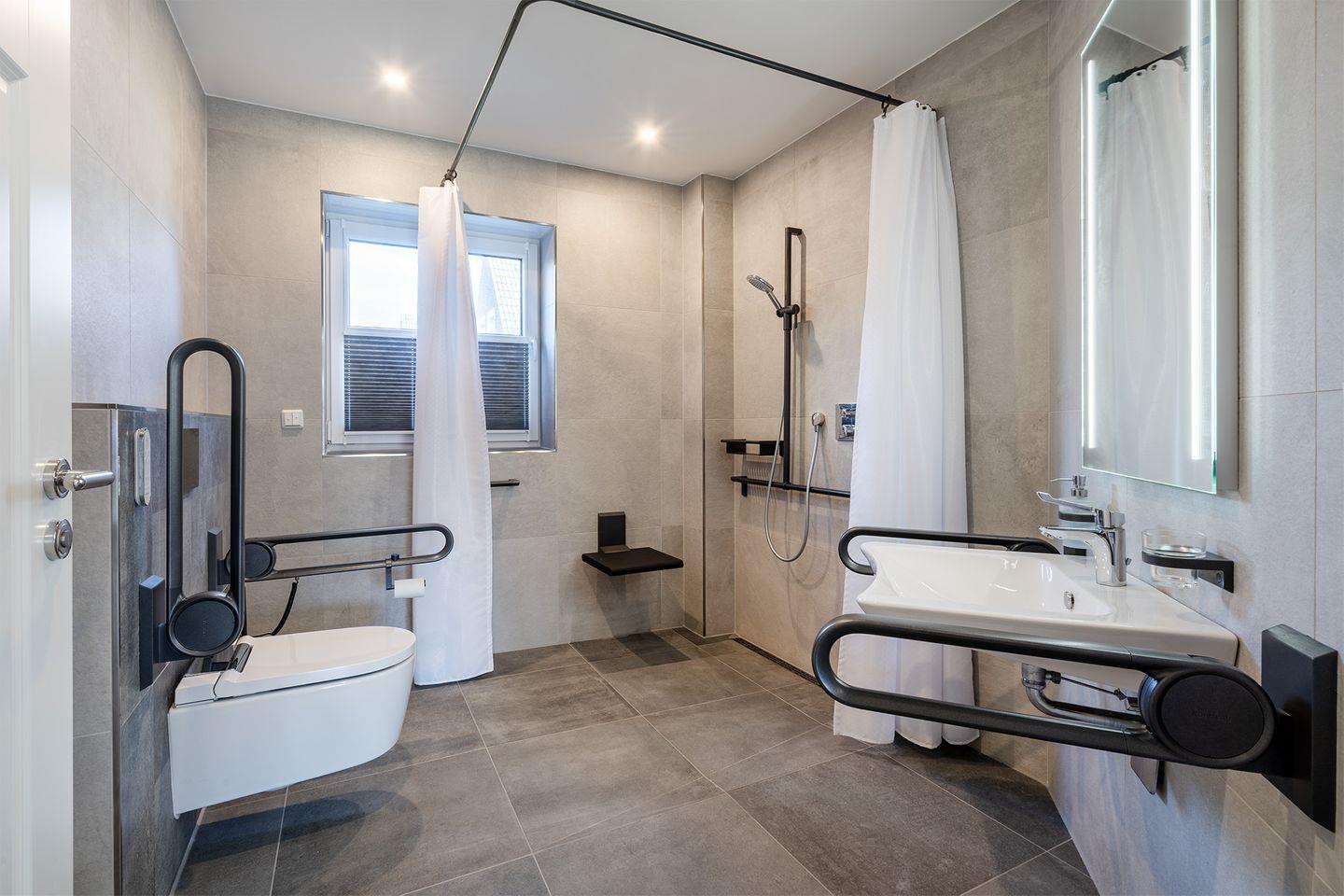 Duschbad: Behindertengerecht eingerichtet, mit einer vollautomatischen Toilette und Duschfunktion.