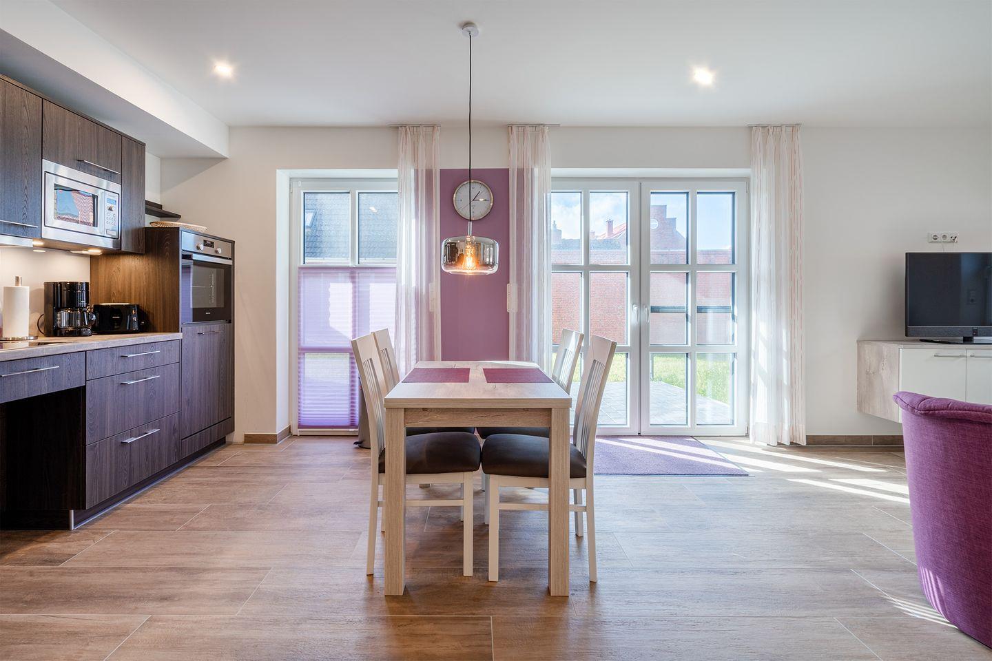 Wohnraum: Mit vollständig ausgestatteter Küche und einem hellen Essplatz.