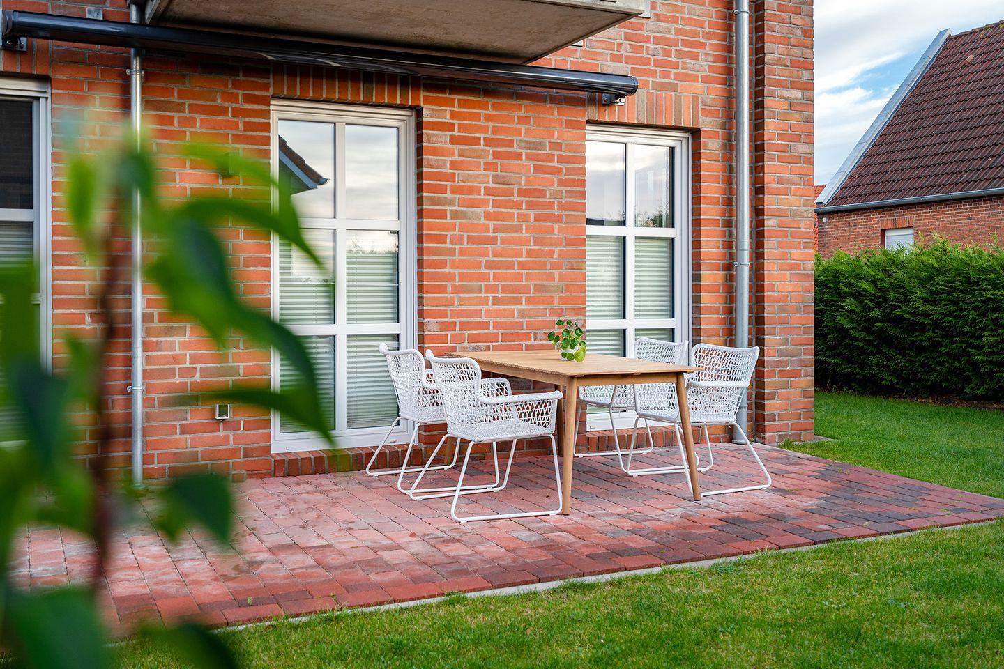 Die Terrasse ist mit gemütlichen Gartenmöbeln und einer elektrischen Markise ausgestattet.
