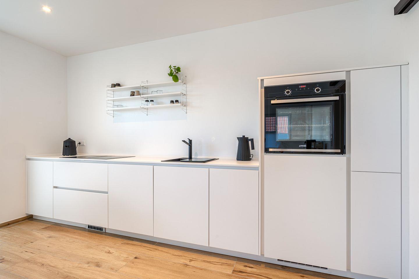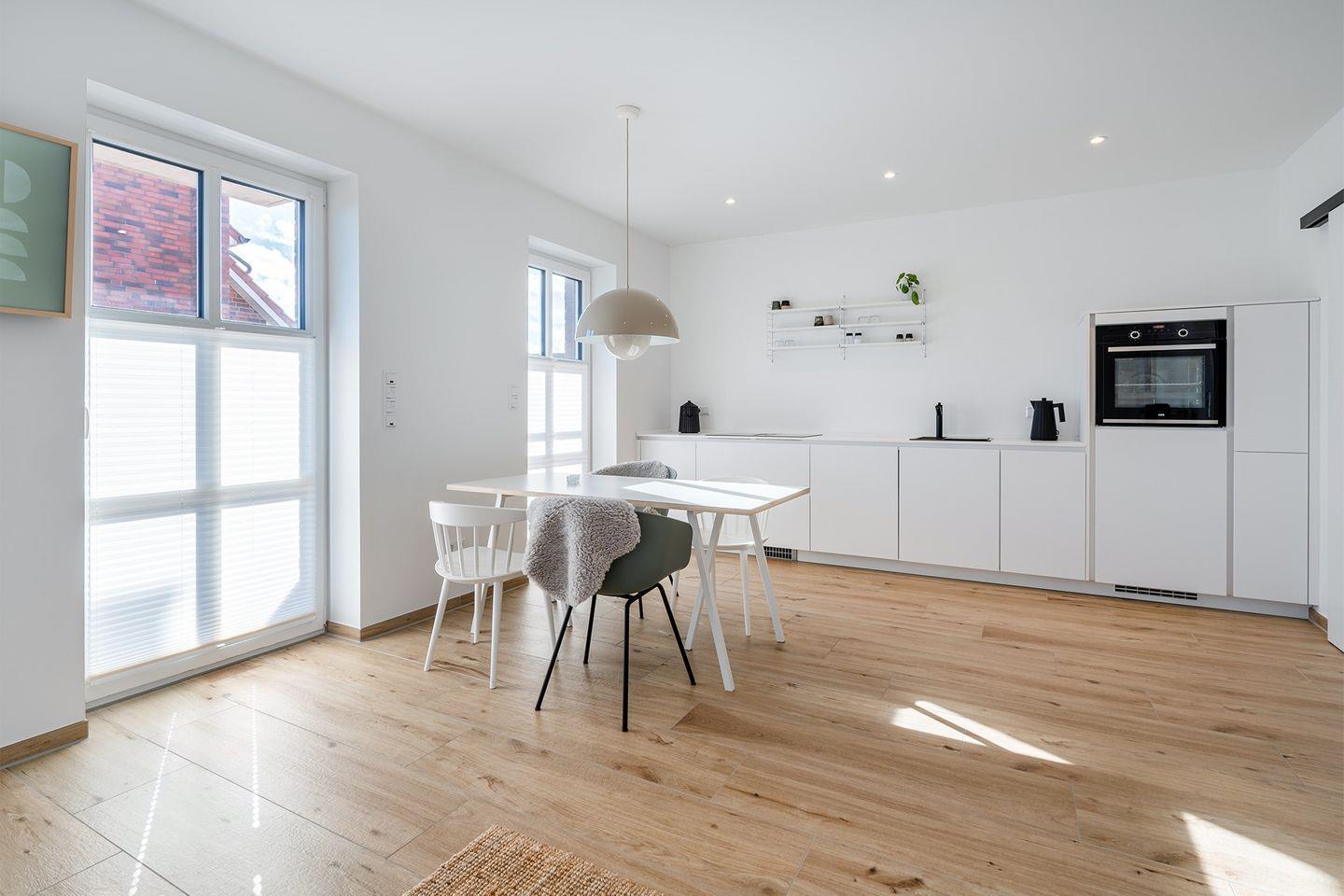 Wohnraum: Kombinierter Küchen- und Essbereich, in dem bodentiefe Fenster für viel Licht sorgen.
