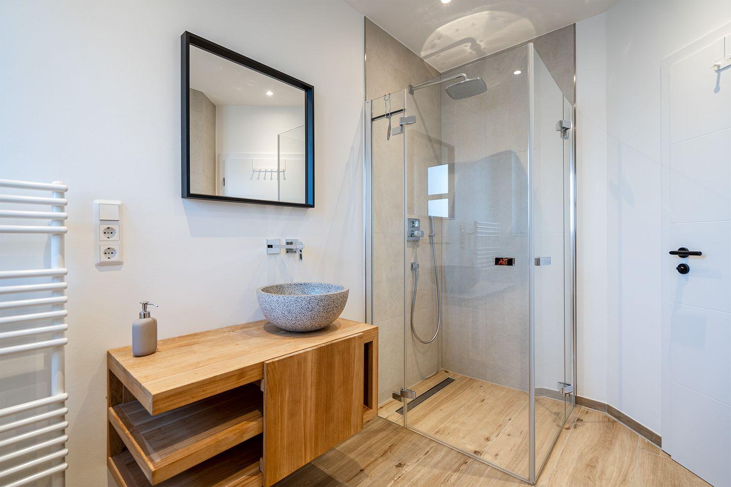 Badezimmer: Mit WC und einer bodengleichen Dusche.