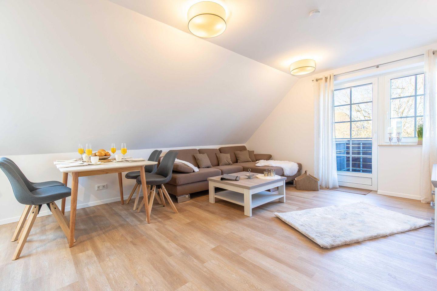 Im Wohnbereich steht Ihnen ein Essplatz für vier Personen, sowie eine gemütliche Sofaecke zur Verfügung. Ausgestattet mit einer Küche, Smart TV, WLAN und einem neuen Badezimmer. Durch die zentrale Lage ist der Ortskern mit vielen Restaurants und Einkaufsmo¨glichkeiten in wenigen Gehminuten zu erreichen.