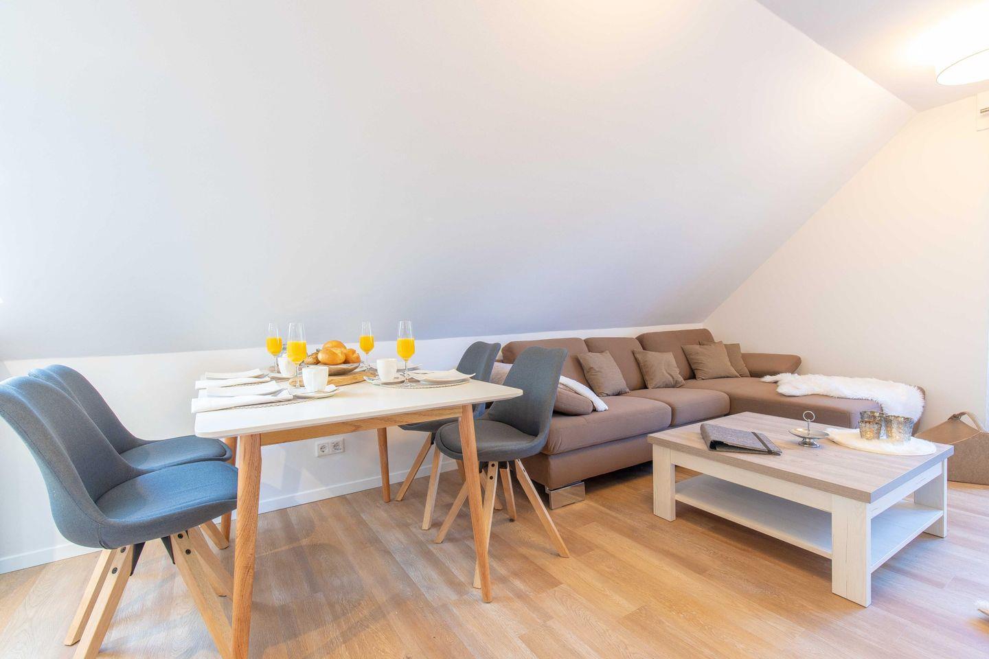 Der gemütliche Wohnbereich verfügt über einen Essplatz für vier Personen sowie eine einladende Sofaecke. Hier können Sie zusammen essen oder entspannen.
