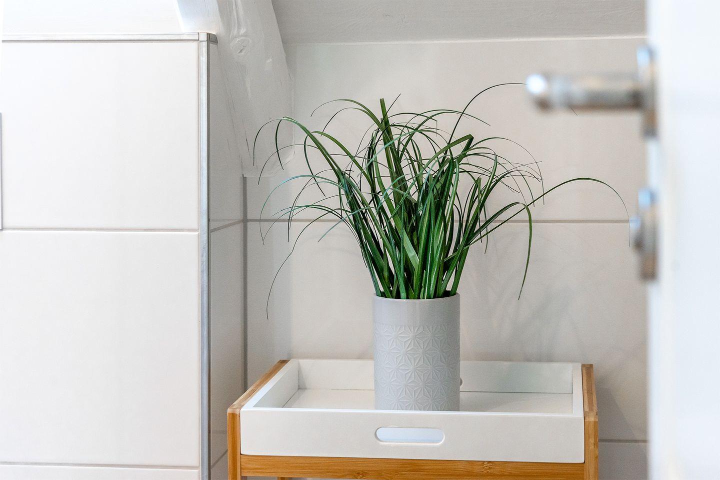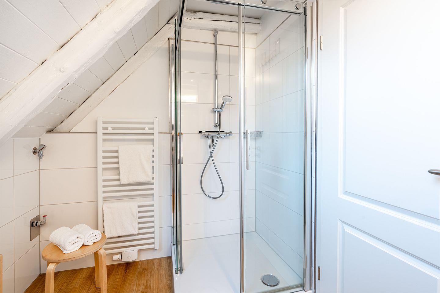 Die Wohnung im Obergeschoss bietet einen offenen Wohn- und Essbereich. Das gemütliche Bett befindet sich in der Dachschräge mit Blick auf die offenen Holzbalken. Die moderne weiße Küche ist komplett ausgestattet, sodass Sie für einen Kochabend bestens gerüstet sind. Am kleinen Esstisch können Sie zum Frühstück oder Abendessen sitzen und die ruhige Atmosphäre genießen.