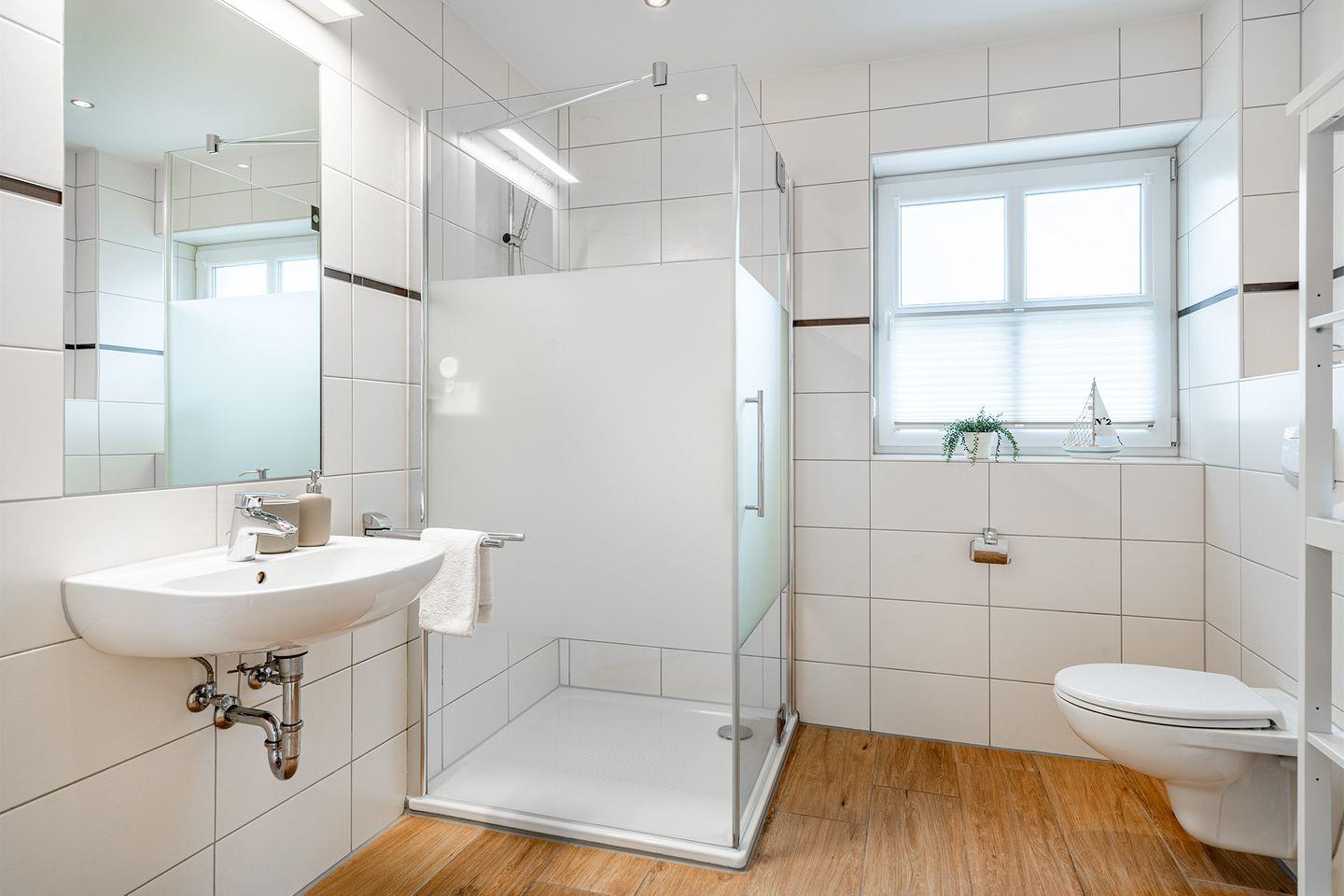 Das moderne Bad verfügt über eine bodengleiche begehbare Dusche und alle weiteren Annehmlichkeiten, die Sie benötigen, um sich morgens frisch zu machen und zu entspannen.