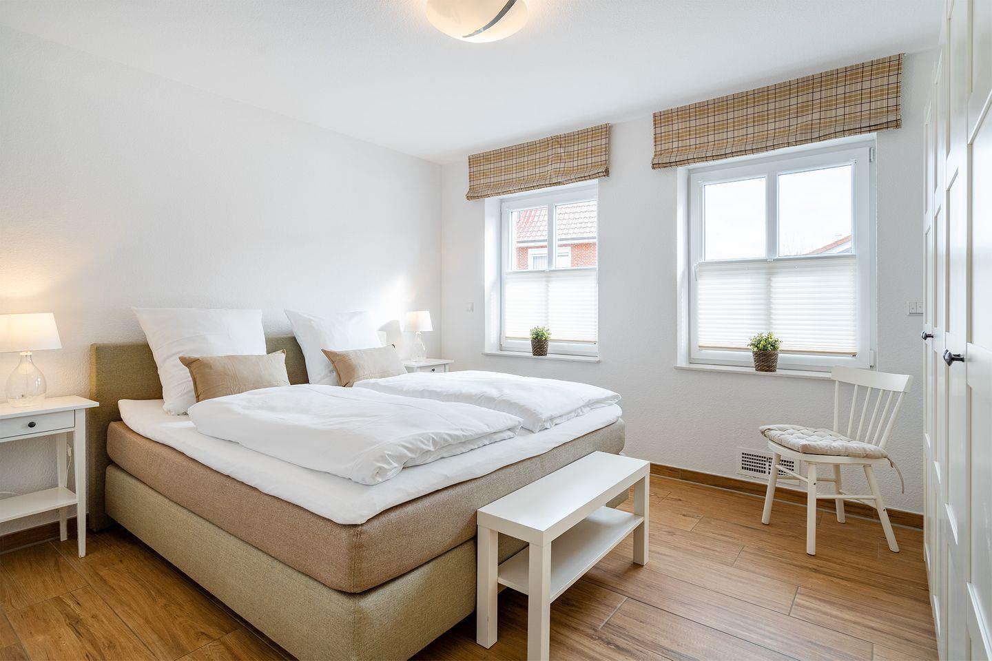 Das Hauptschlafzimmer ist mit einem bequemen 1,80 m Boxspringbett und einem großen Kleiderschrank ausgestattet, sodass Sie Ihre Kleidung gut verstauen können.