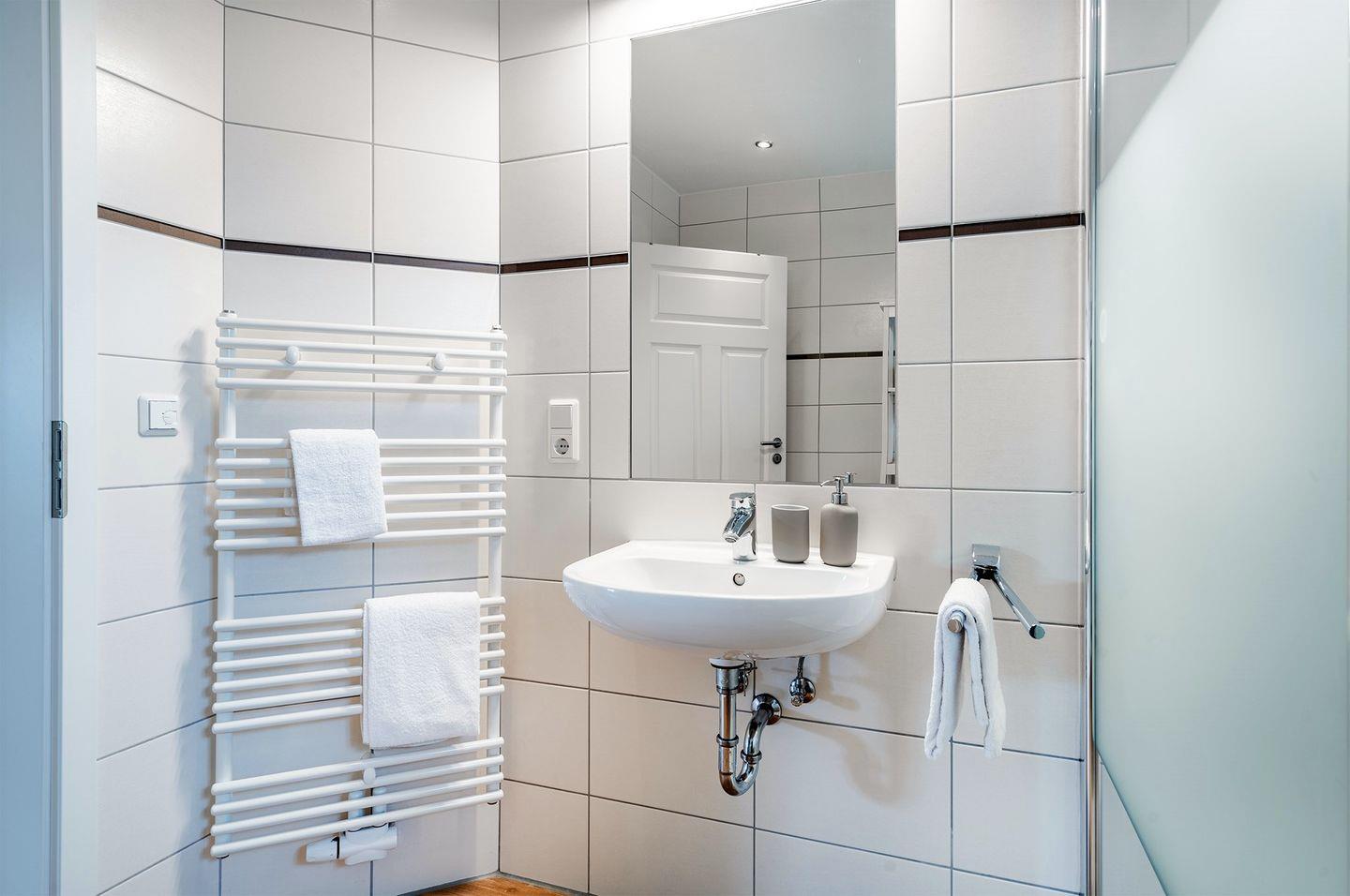 Das moderne Badezimmer verfügt über eine bodengleiche begehbare Dusche und alle Annehmlichkeiten, die Sie für Ihre morgendliche Frische benötigen.