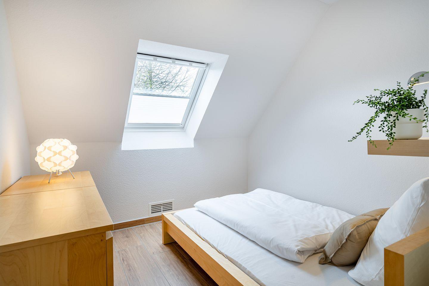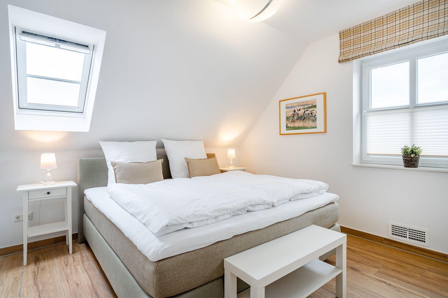 Das Schlafzimmer ist mit einem komfortablen 180x200 cm Boxspringbett ausgestattet und bietet viel Stauraum in einem großen Kleiderschrank.