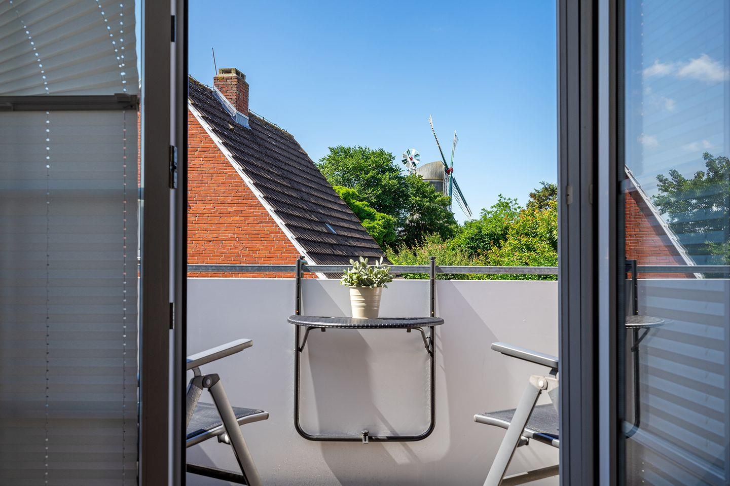 Genießen Sie die ruhige Atmosphäre auf Ihrem Balkon mit direktem Blick auf eine der beiden Zwillingsmühlen – der ideale Ort, um den Tag ausklingen zu lassen.