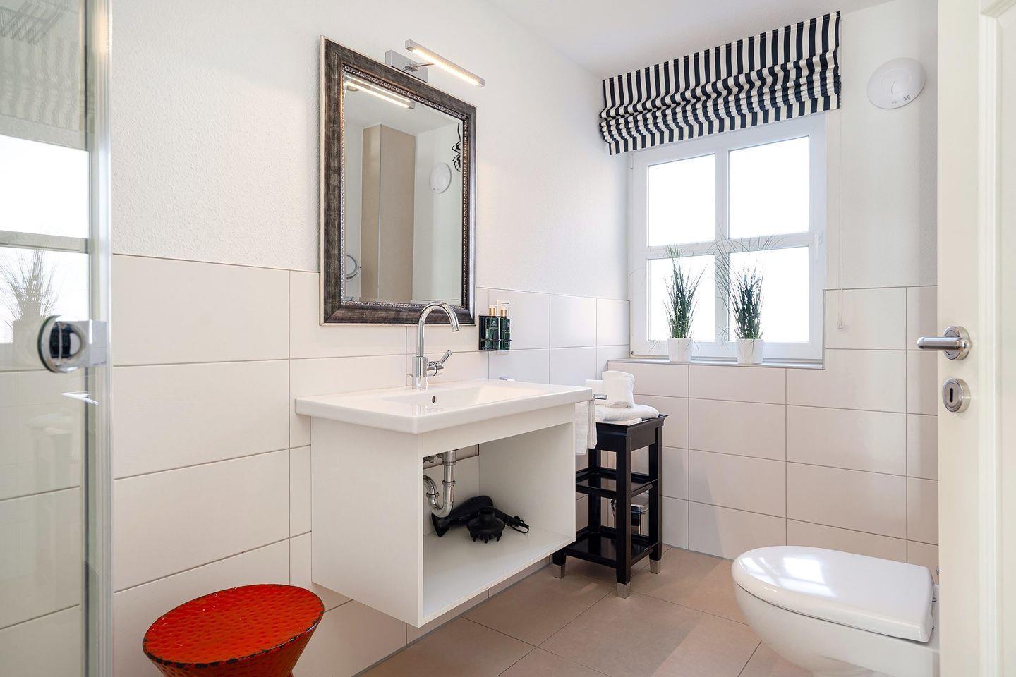 Badezimmer: Das Badezimmer verfügt über eine elegante bodengleiche Dusche, die mit einem "Raindancer"-Duschkopf ausgestattet ist, um Ihnen ein luxuriöses Duscherlebnis zu bieten.