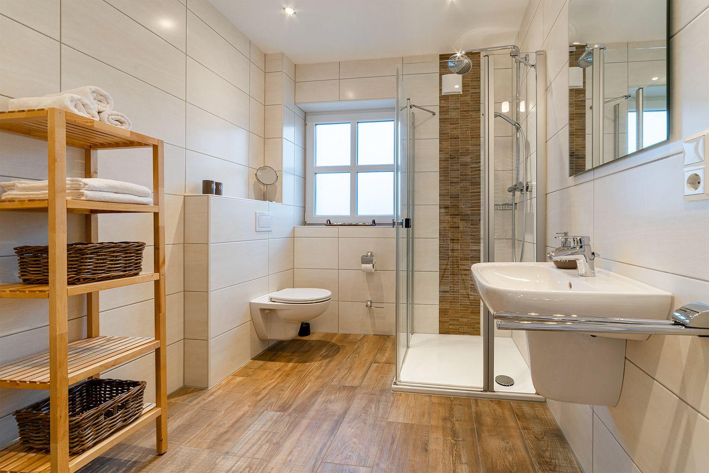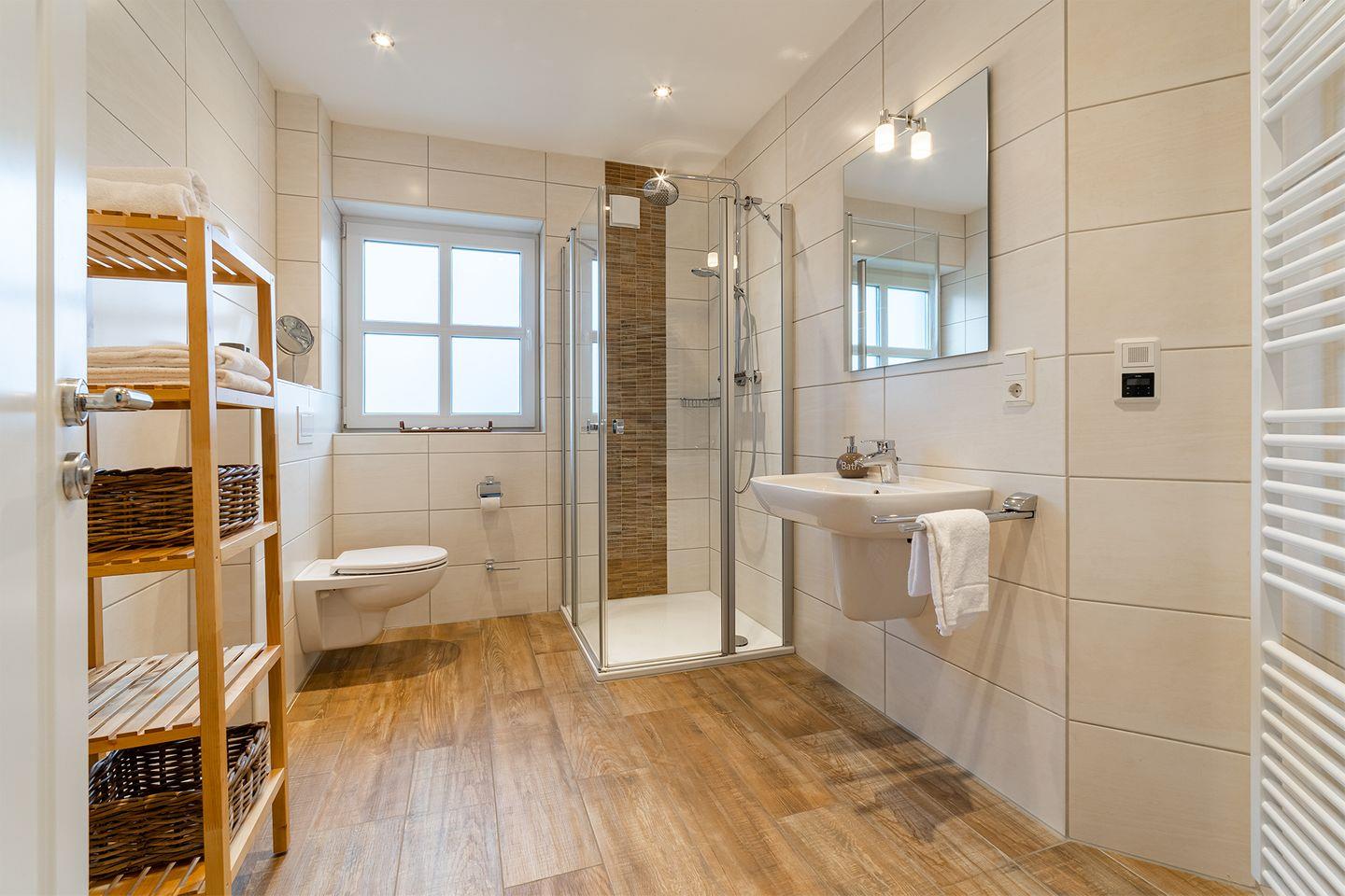 Das Tageslichtbad bietet eine bodengleiche Dusche mit integrierter Regendusche.