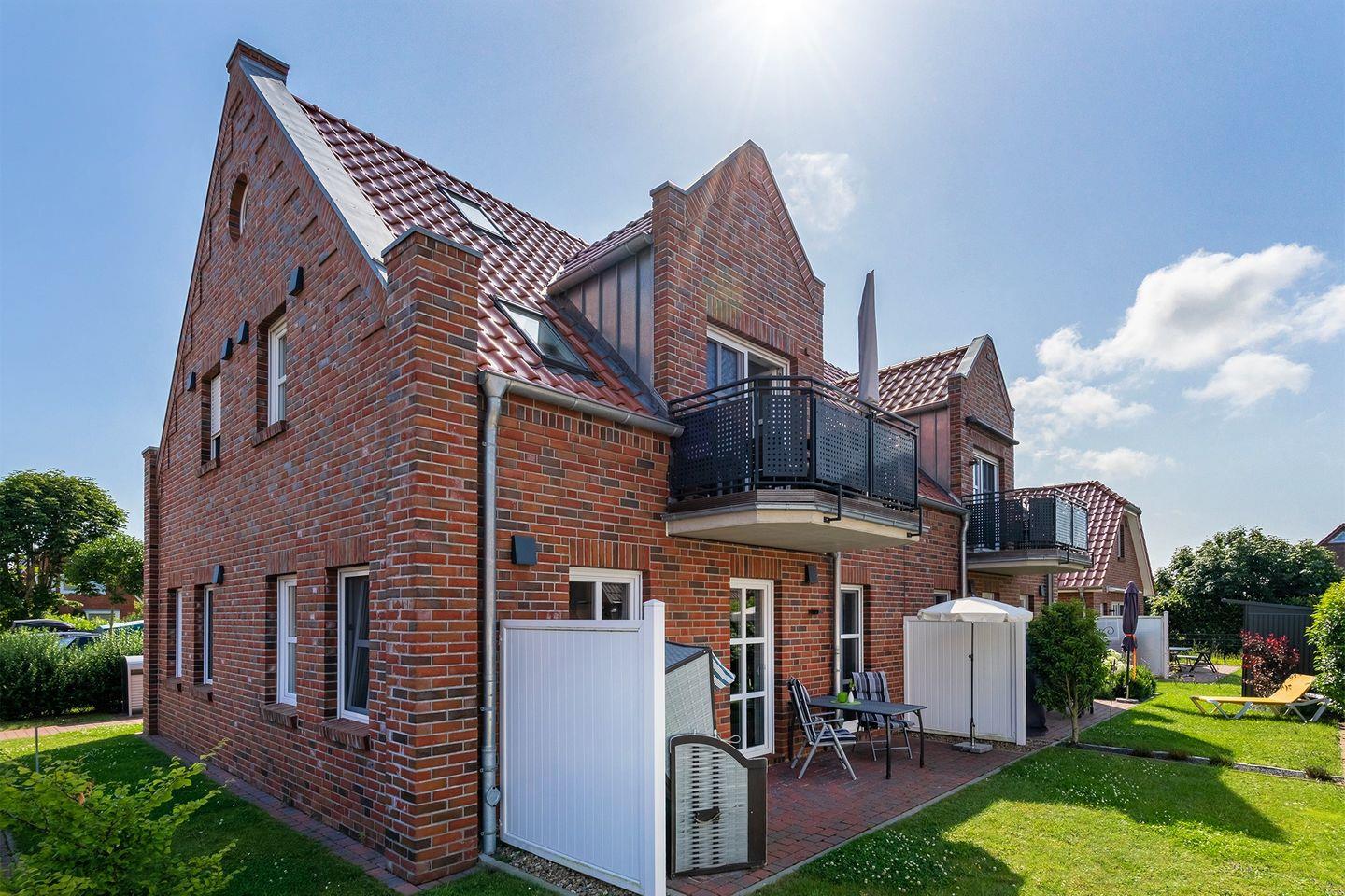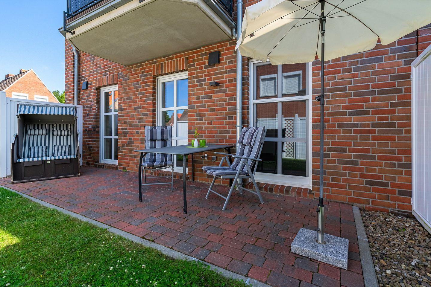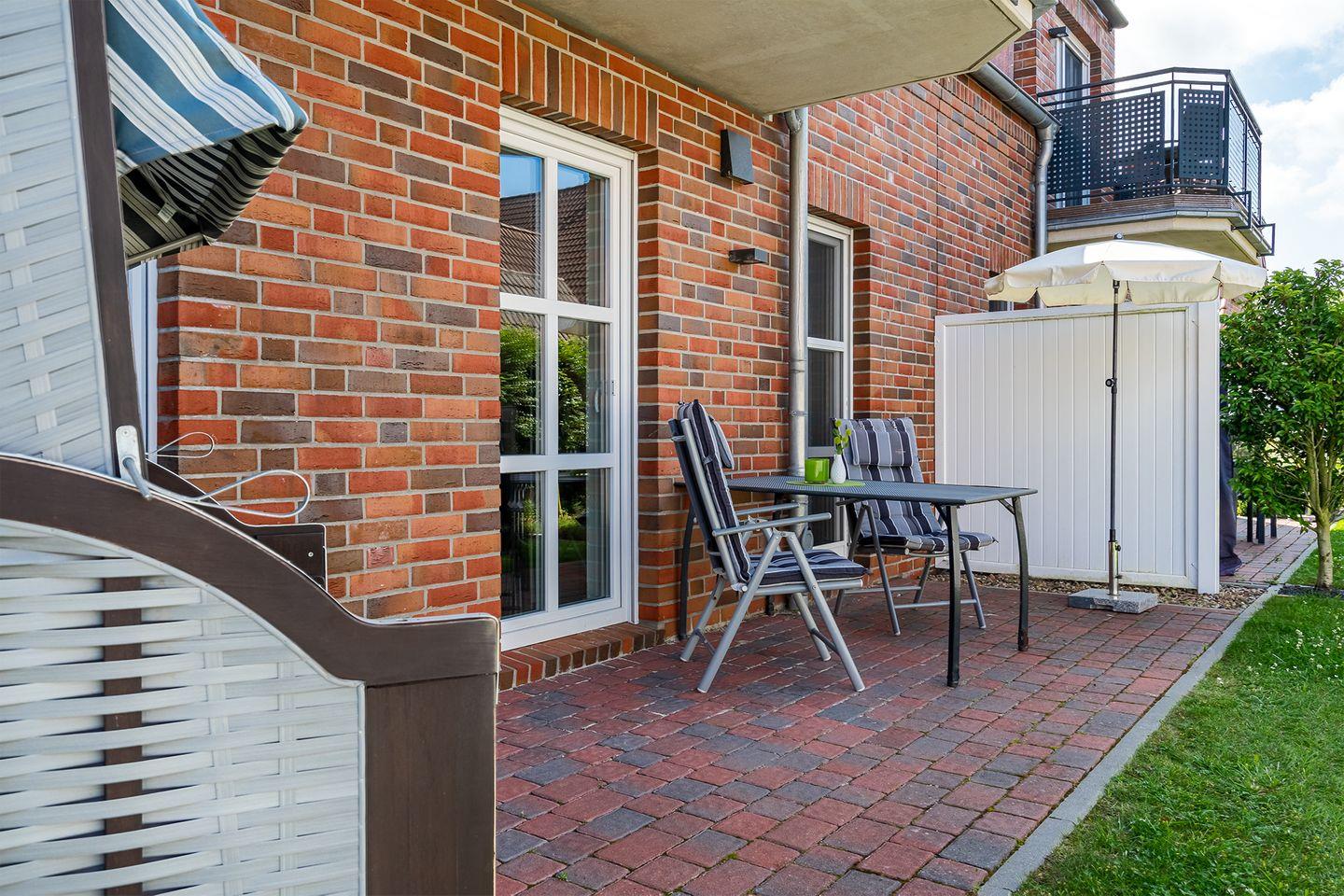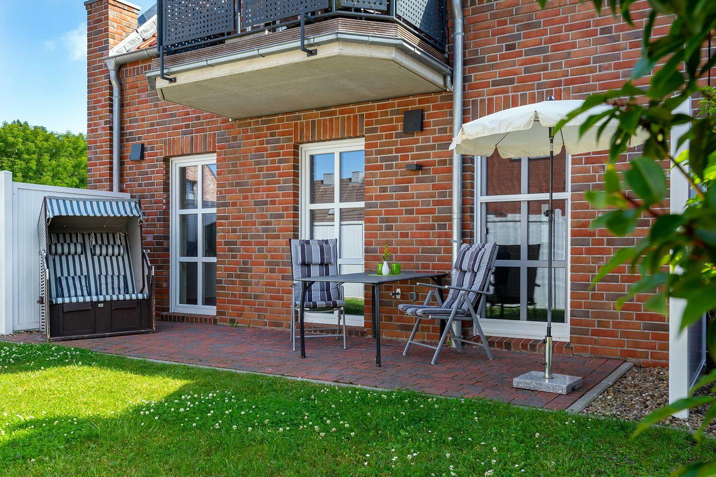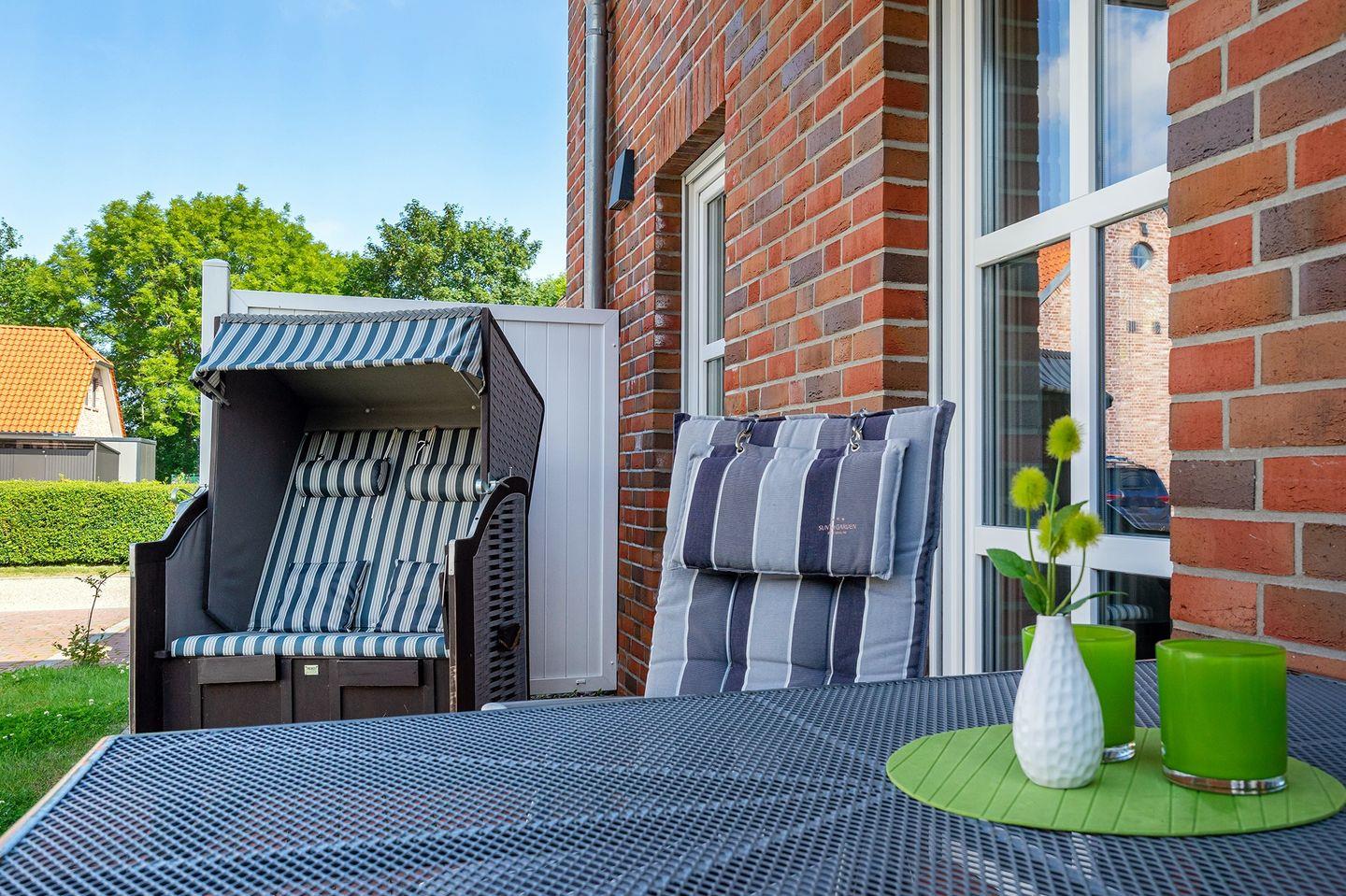 Ein Strandkorb und bequeme Terrassenmöbel sorgen für echtes Nordsee-Urlaubsfeeling.