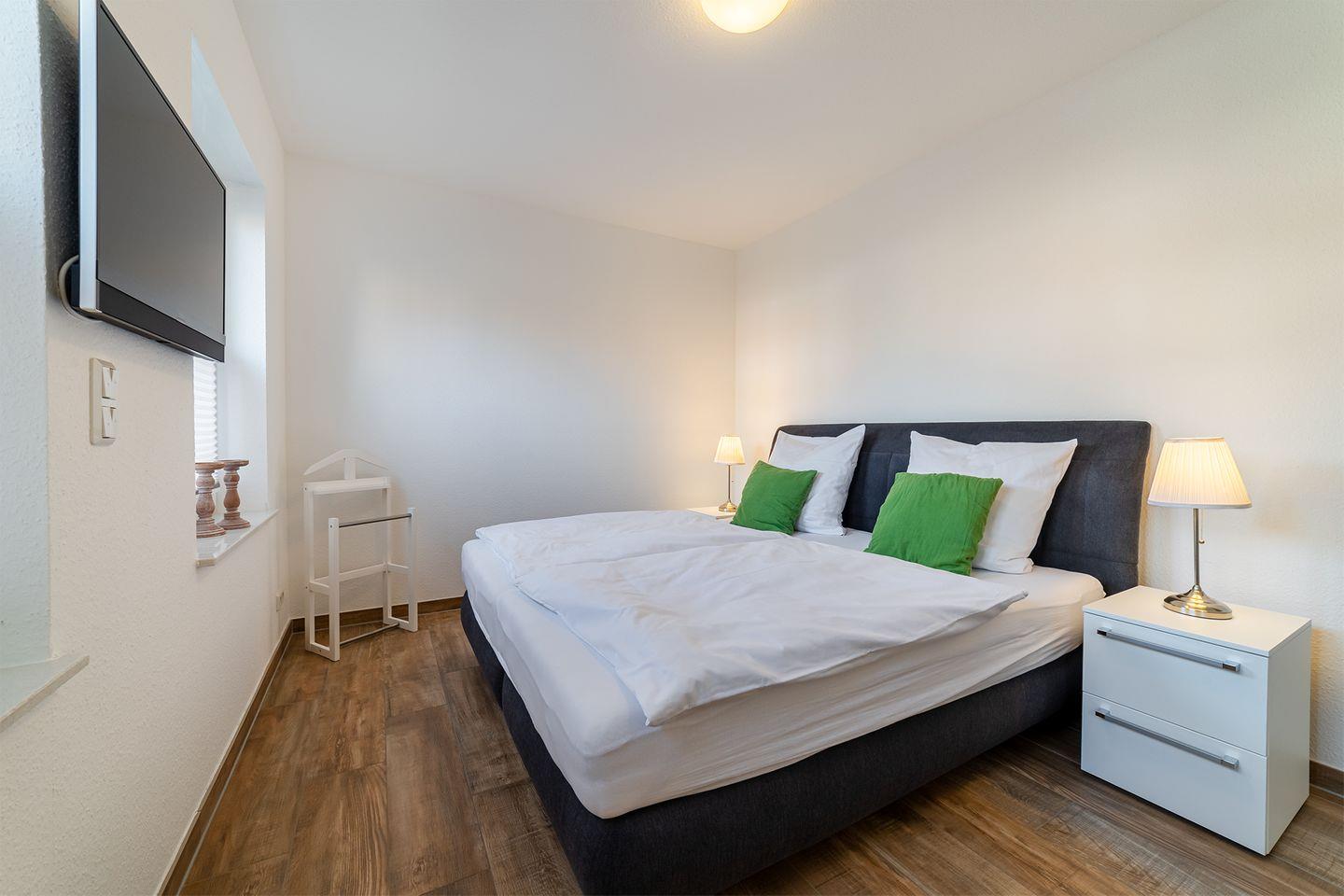 Das Schlafzimmer ist ausgestattet mit einem bequemen Boxspringbett, einem geräumigen Kleiderschrank und einem stummen Diener zum Ablegen Ihrer Sachen.