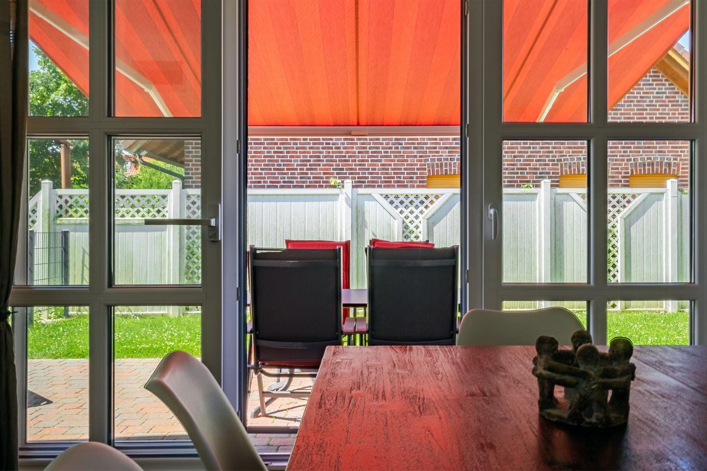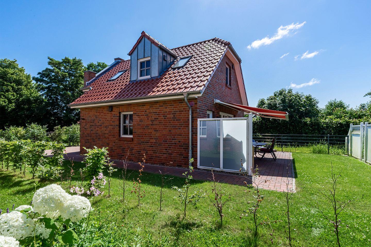 Bei schönem Wetter genießen Sie die großzügige Terrasse, die mit einem Strandkorb, Relaxliegen und einer Markise als Sonnenschutz ausgestattet ist – ideal, um draußen zu entspannen.