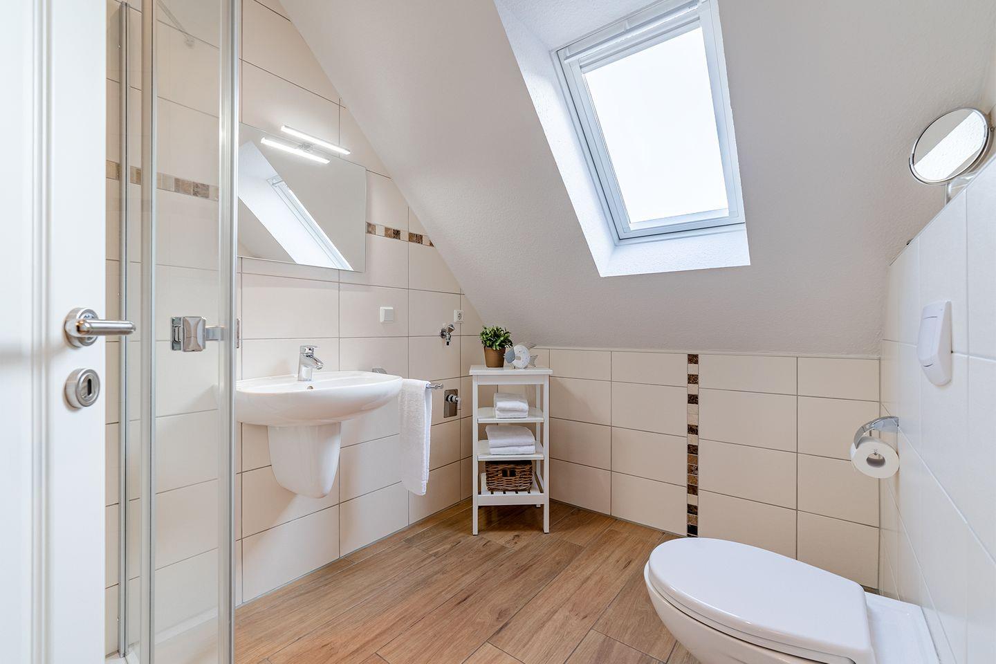 Das moderne Badezimmer ist mit einer bodengleichen Dusche und WC ausgestattet und garantiert Wohlfühlkomfort.