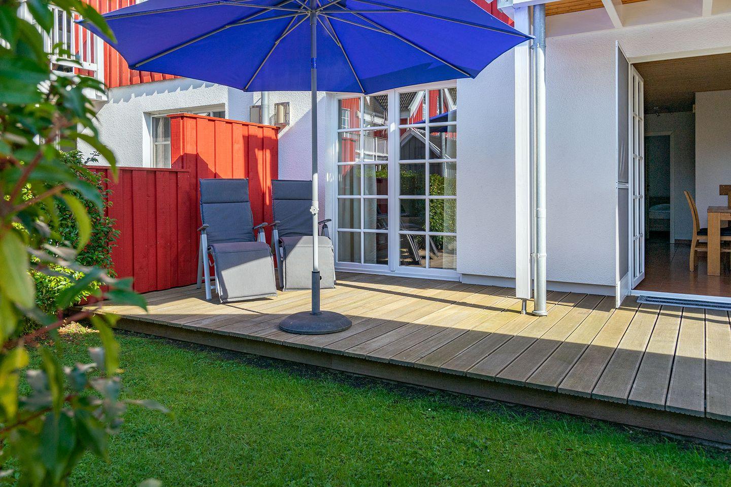 Im Außenbereich erwartet Sie eine schöne Terrasse mit einem Elektrogrill, der für gemütliche Grillabende sorgt. Ein abschließbares Gartenhaus bietet Platz für Ihre Fahrräder und sichert diese während Ihres Aufenthaltes.