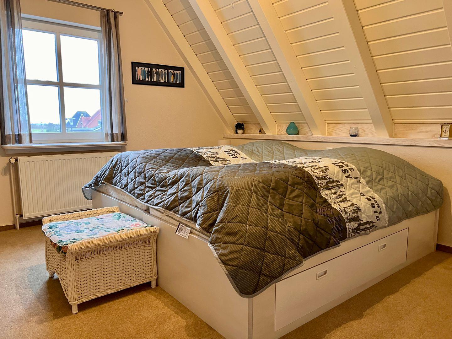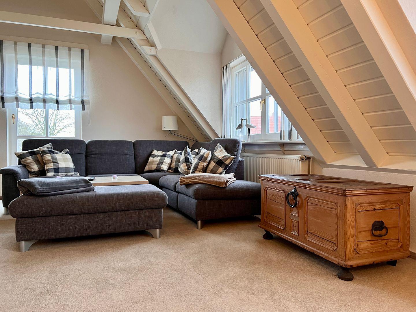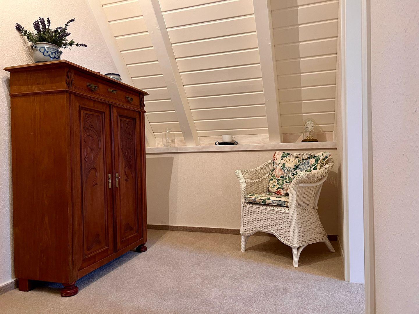 Das Obergeschoss beherbergt ein weiteres Schlafzimmer, ein zweites Badezimmer mit einer Badewanne sowie ein zweites Wohnzimmer mit einem gemütlichen Arbeitsbereich, ideal für längere Aufenthalte, in denen Arbeit und Entspannung nahtlos ineinander übergehen.