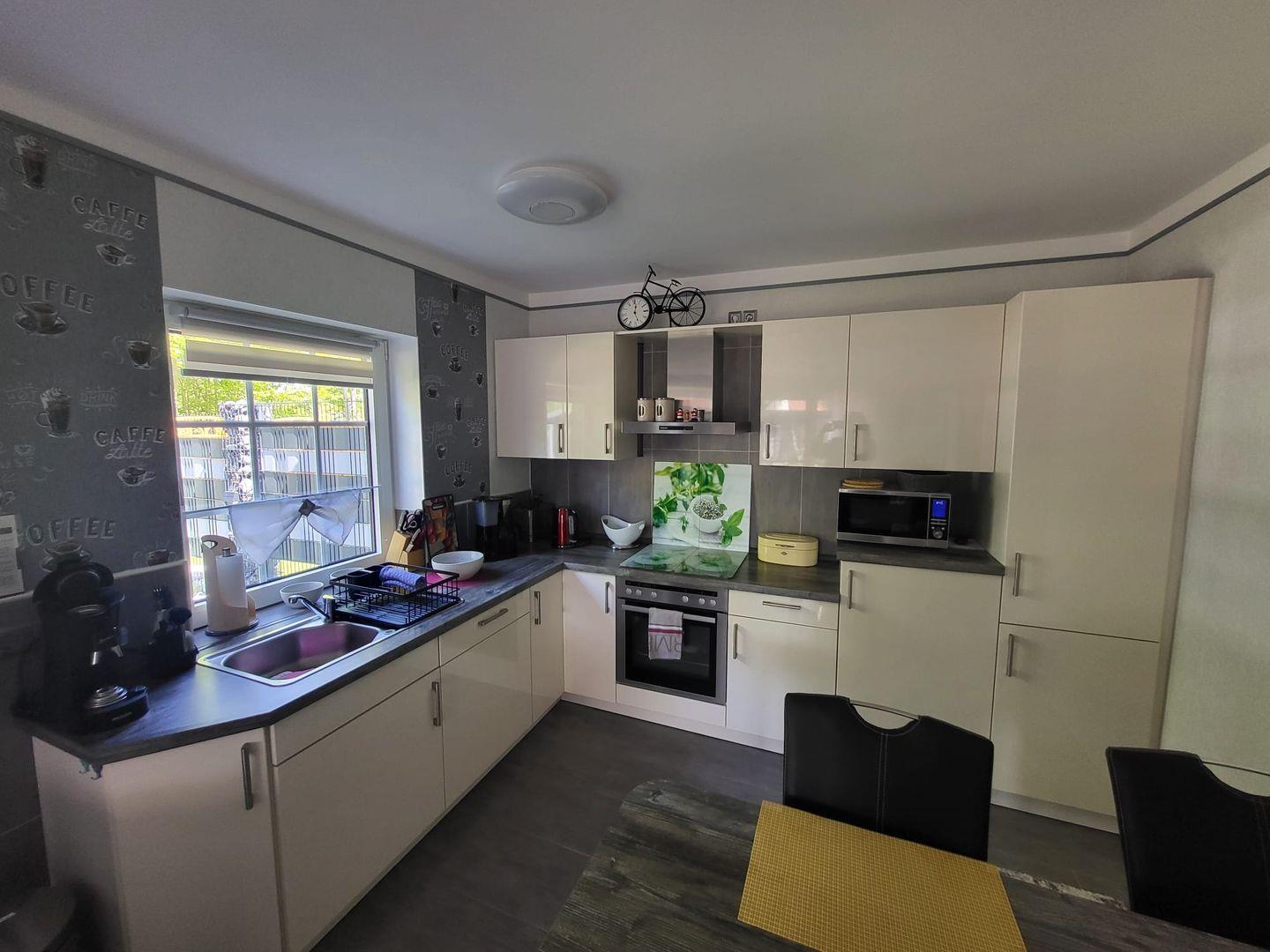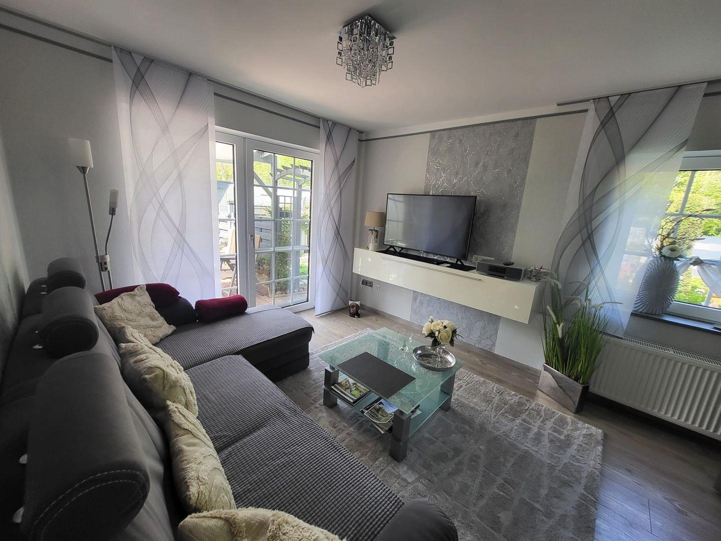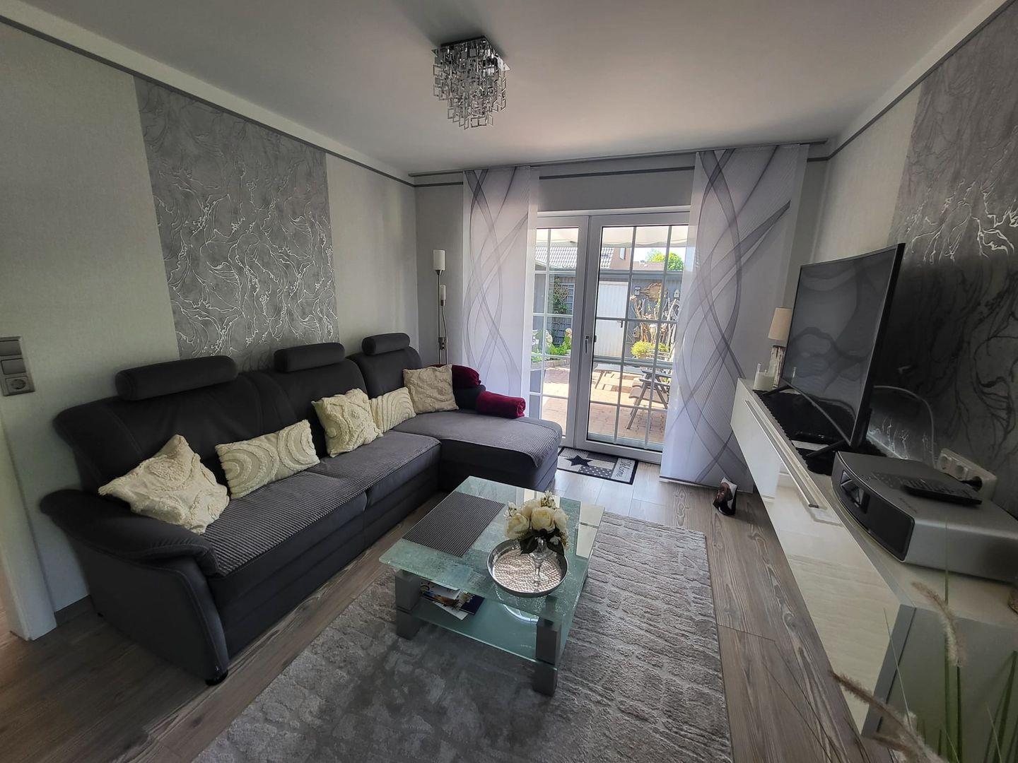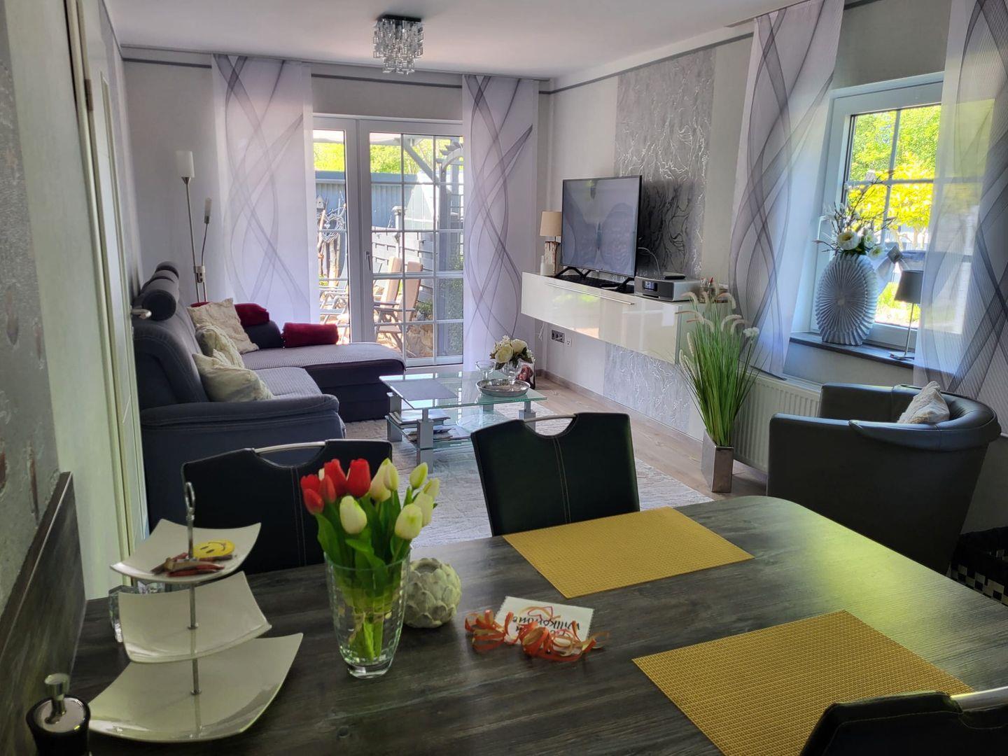 Kommen Sie herein! Vom Flur gelangen Sie in den großzügigen Wohn-/Essbereich. Genießen Sie entspannte Stunden auf dem gemütlichen Sofa mit einem Gläschen Wein und schauen einen schönen Film. Am Esstisch können zubereitete Speisen serviert werden. Die moderne helle Küche ist voll ausgestattet. Hier hat der Hobbykoch seine Freude. Ein Gäste-WC befindet sich ebenfalls im Erdgeschoss. In der oberen Etage erwarten Sie 2 helle Schlafzimmer, eines mit einem Doppelbett und eines mit 2 Einzelbetten. Die Eigentümer vermieten das Objekte nur an max. 2 Gäste! Das Bad ist eine kleine Wellnessoase. Mit heller Ausstattung überzeugt das Bad u. a. mit einer begehbaren großen Dusche und 2 Fenstern.