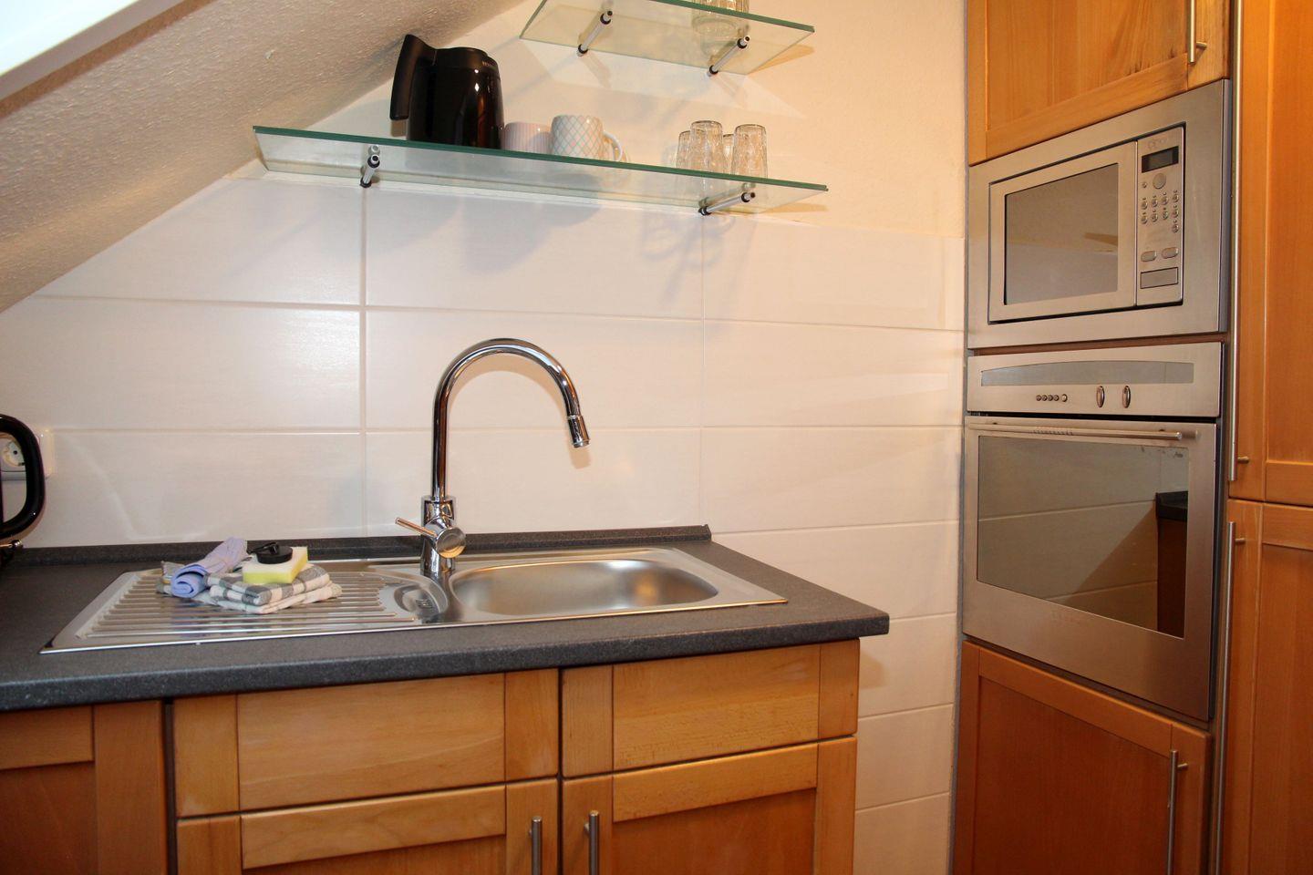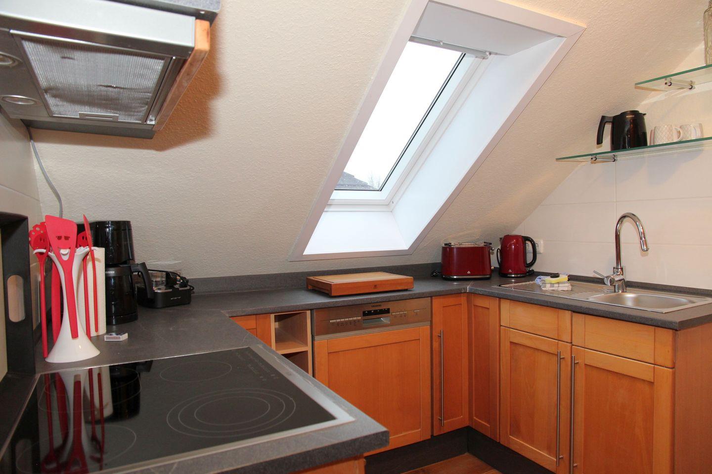 Das Herzstück der Unterkunft bildet der helle Wohn- und Essbereich mit Holzboden, das durch große Fenster ein angenehmes Wohngefühl bietet. Hier finden Sie ein gemütliches Sofa mit zwei Sesseln, einen Smart-TV und den Esstisch. Der offene Küchenbereich ist zum Wohnbereich ausgerichtet und voll ausgestattet: Ein moderner Ceran-Herd, Backofen, Mikrowelle, Spülmaschine, Kühlschrank und ein zusätzlicher Gefrierschrank stehen zu Ihrer Verfügung. Selbstverständlich finden Sie auch Küchenutensilien, einen Wasserkocher, eine Kaffeemaschine und einen Toaster - alles Notwendige für einen komfortablen Aufenthalt.