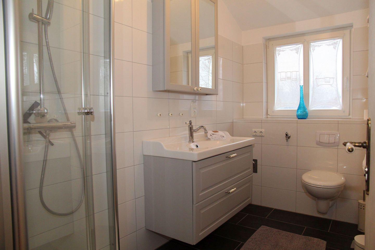 Das Badezimmer überzeugt durch eine bodengleiche Dusche, modernes Waschbecken, Spiegel und ein WC. Die Unterkunft ist mit Fliegengittern an den wichtigsten Fenstern ausgestattet.