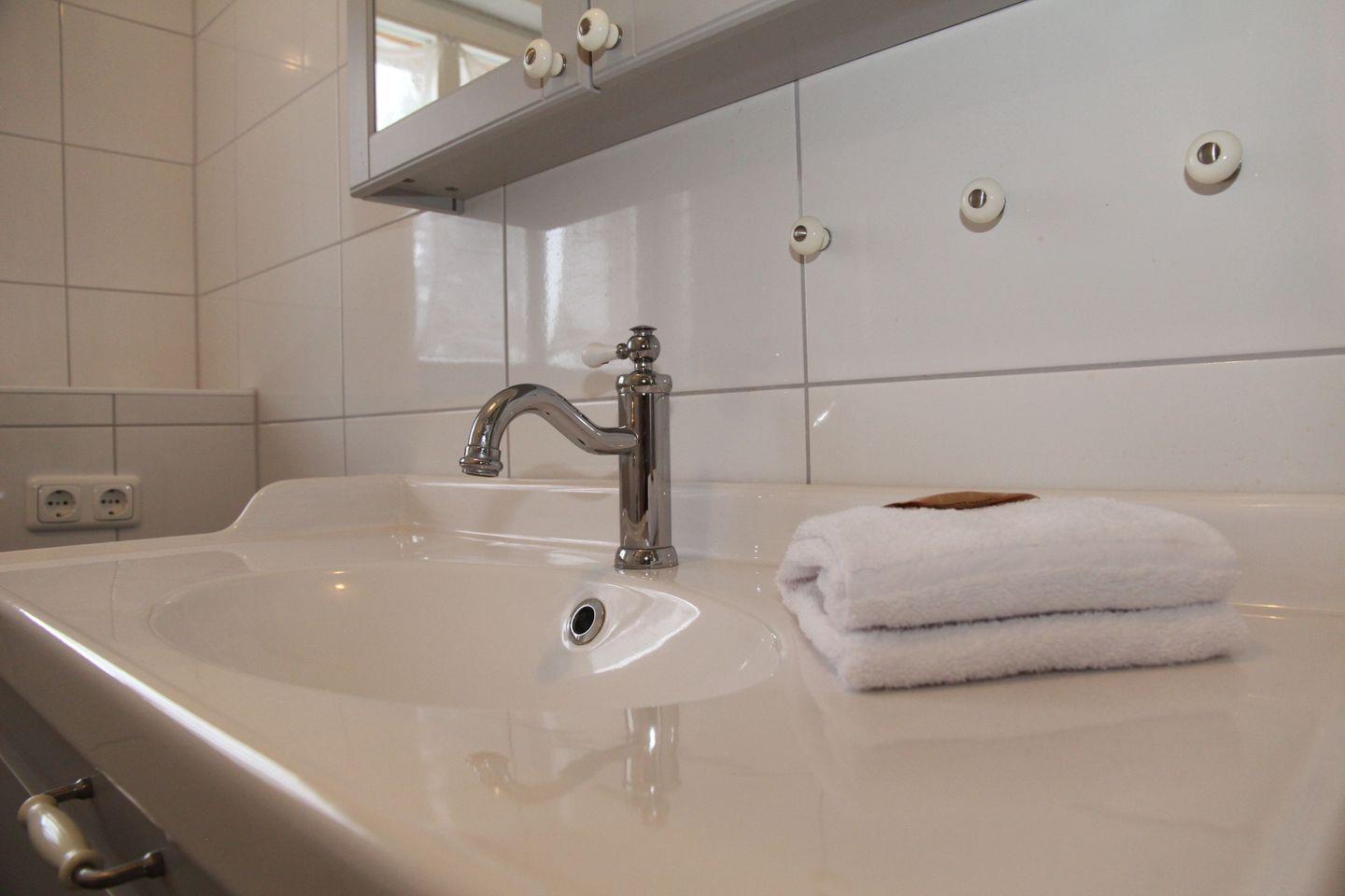 Das Badezimmer überzeugt durch eine bodengleiche Dusche, modernes Waschbecken, Spiegel und ein WC. Die Unterkunft ist mit Fliegengittern an den wichtigsten Fenstern ausgestattet.