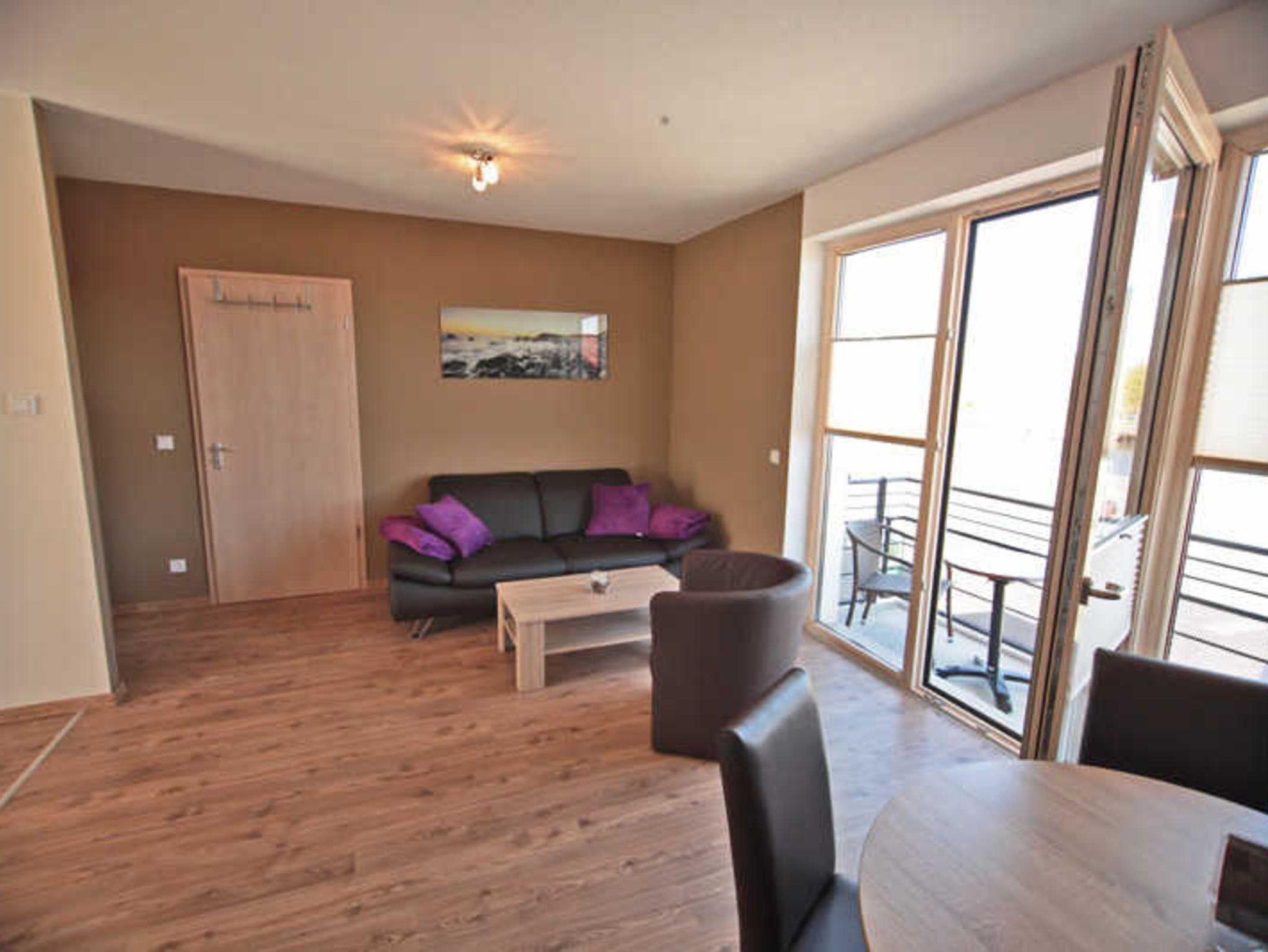 Appartement für 5 Personen: ein Wohnzimmer mit offener Küche und Balkon, ein Schlafzimmer mit Doppelbett, Zustellbetten für die 3. bis 5. Person, ein Bad mit Dusche/WC.