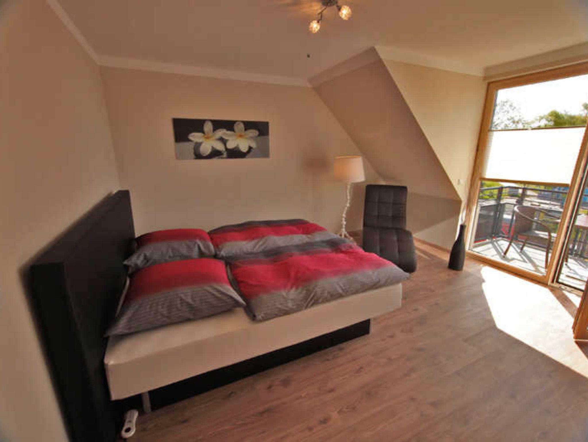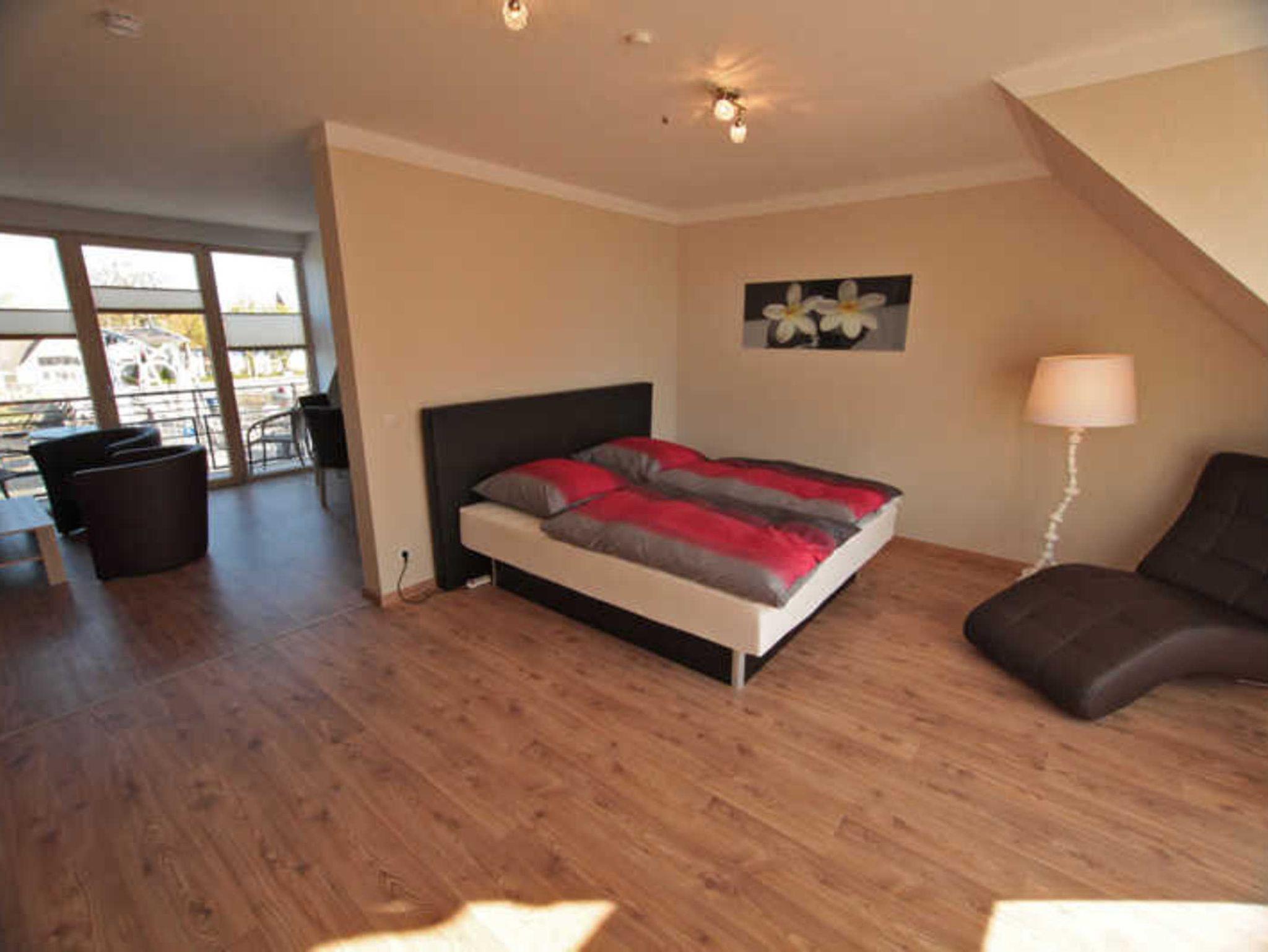 Appartement für 5 Personen: ein Wohnzimmer mit offener Küche und Balkon, ein Schlafzimmer mit einem Wasserbett und einem Doppelbett, für die 5. Person wird ein Zustellbett aufgestellt, ein Bad mit Dusche/WC.