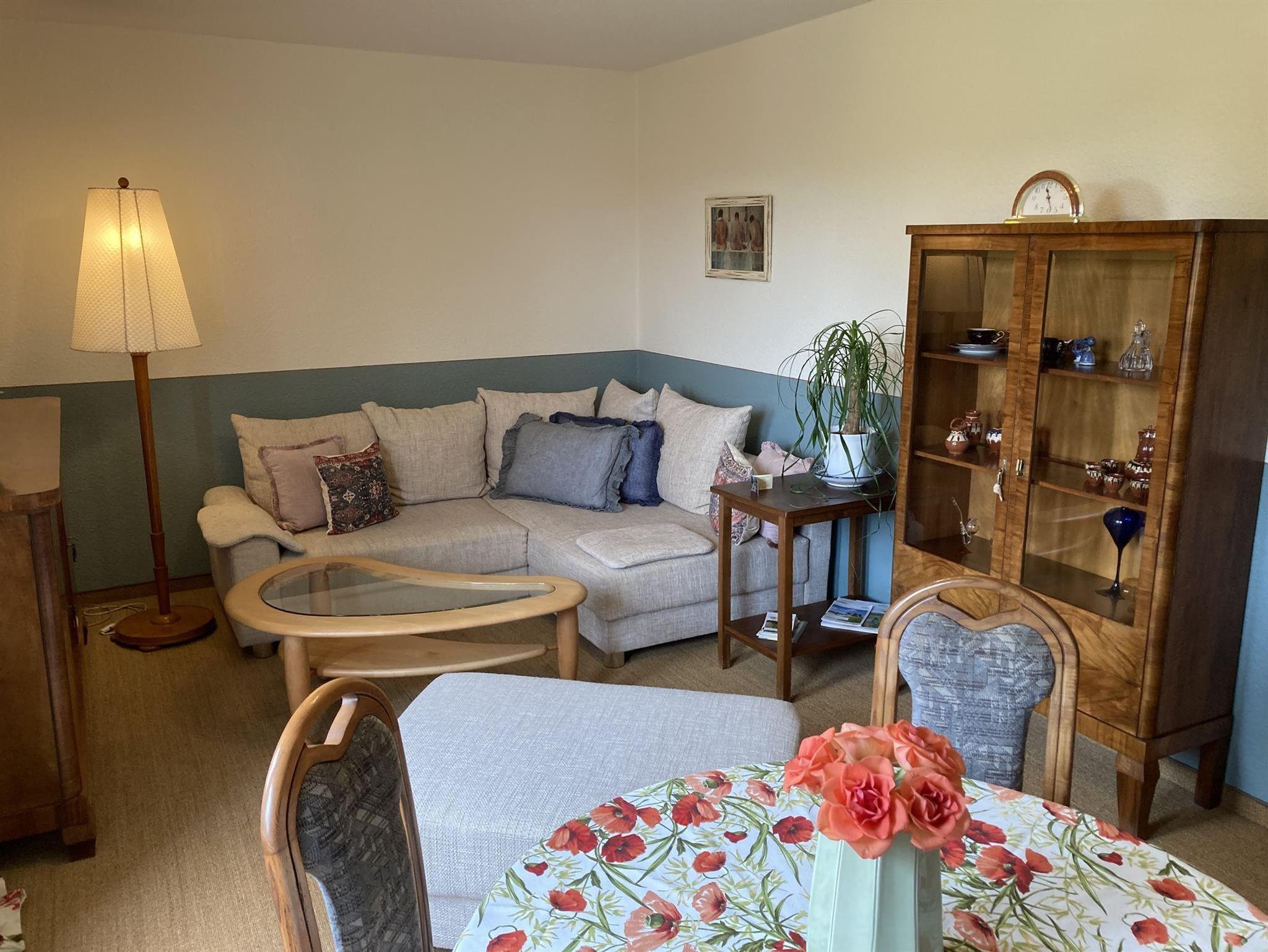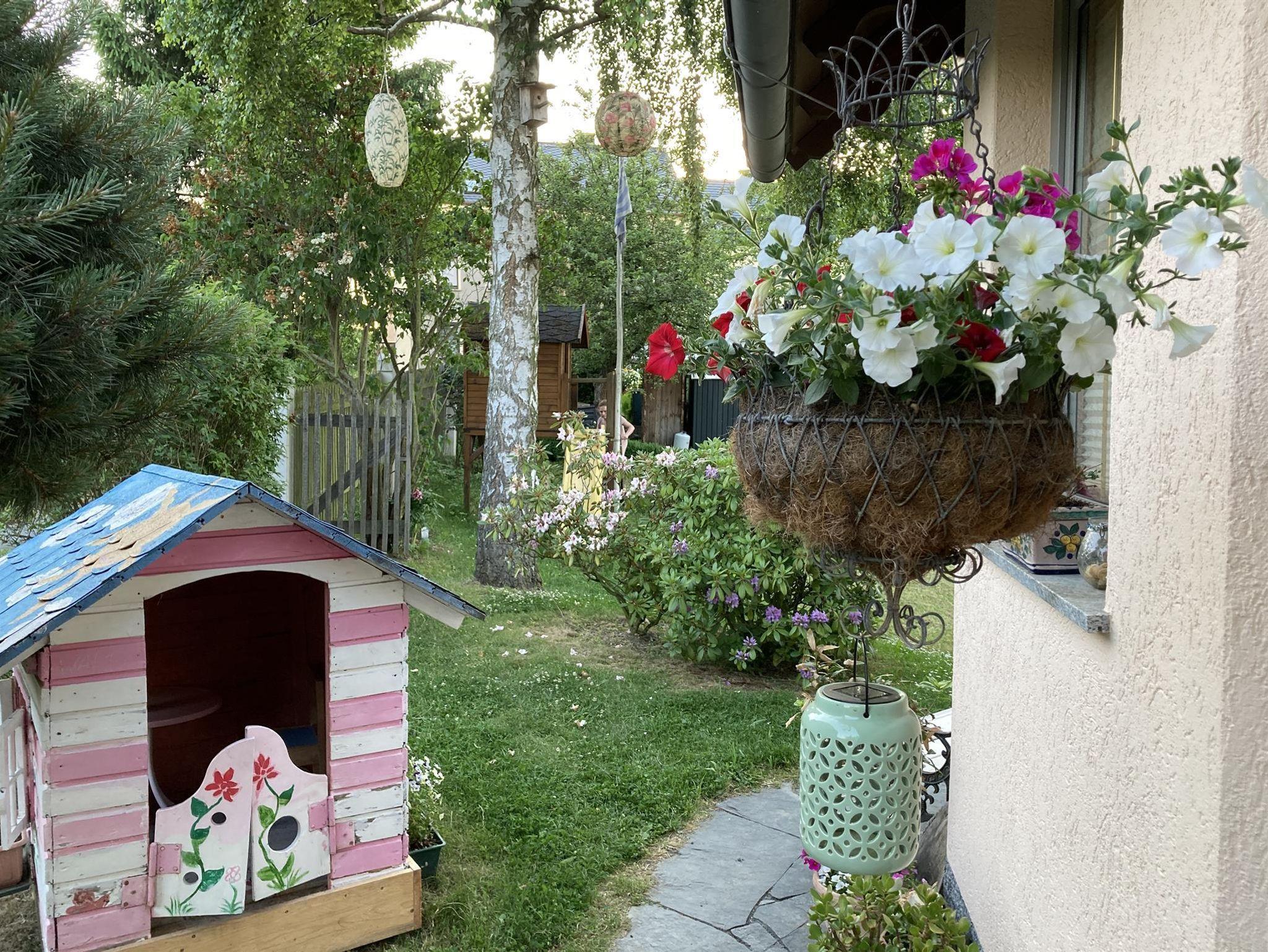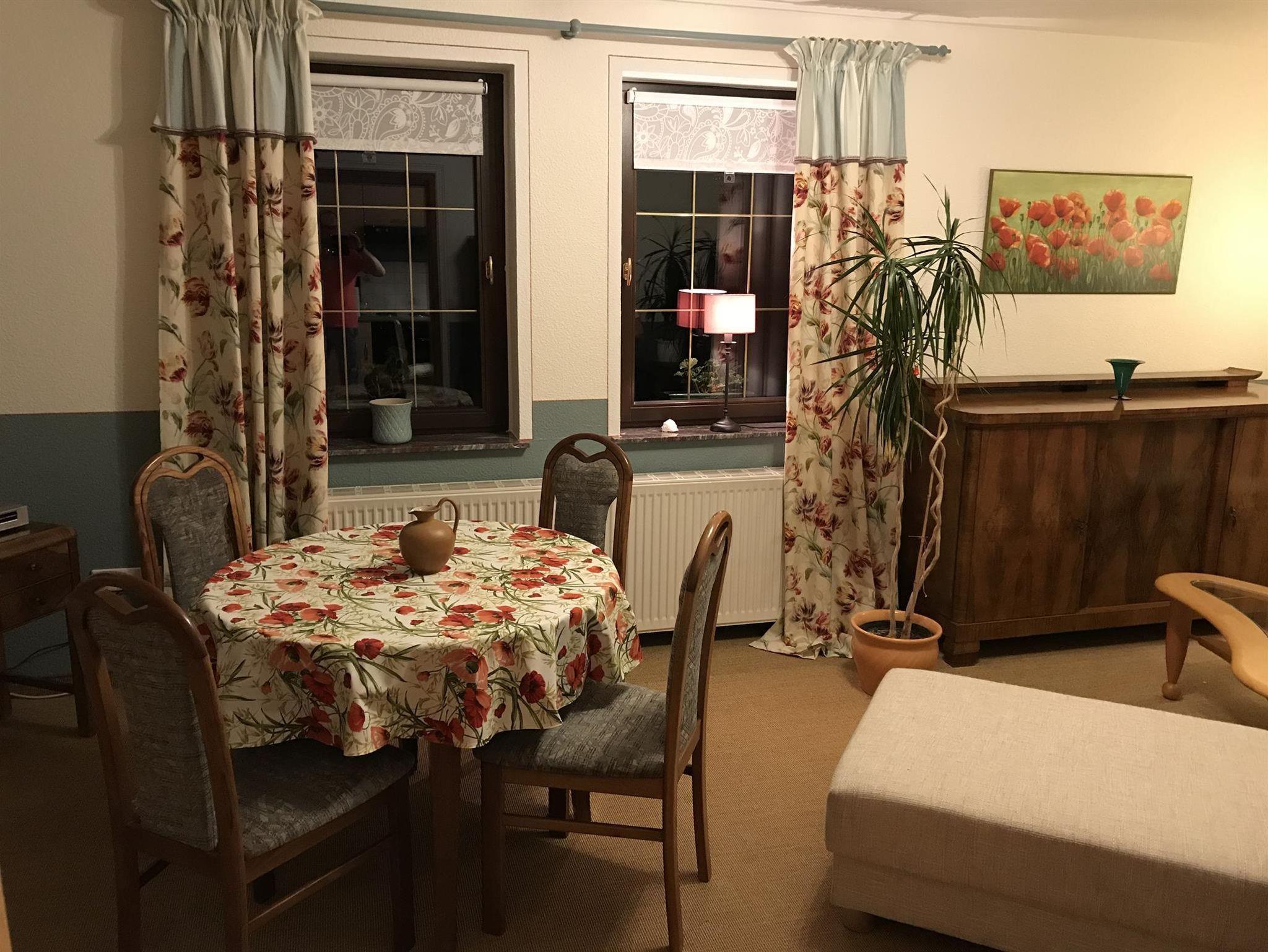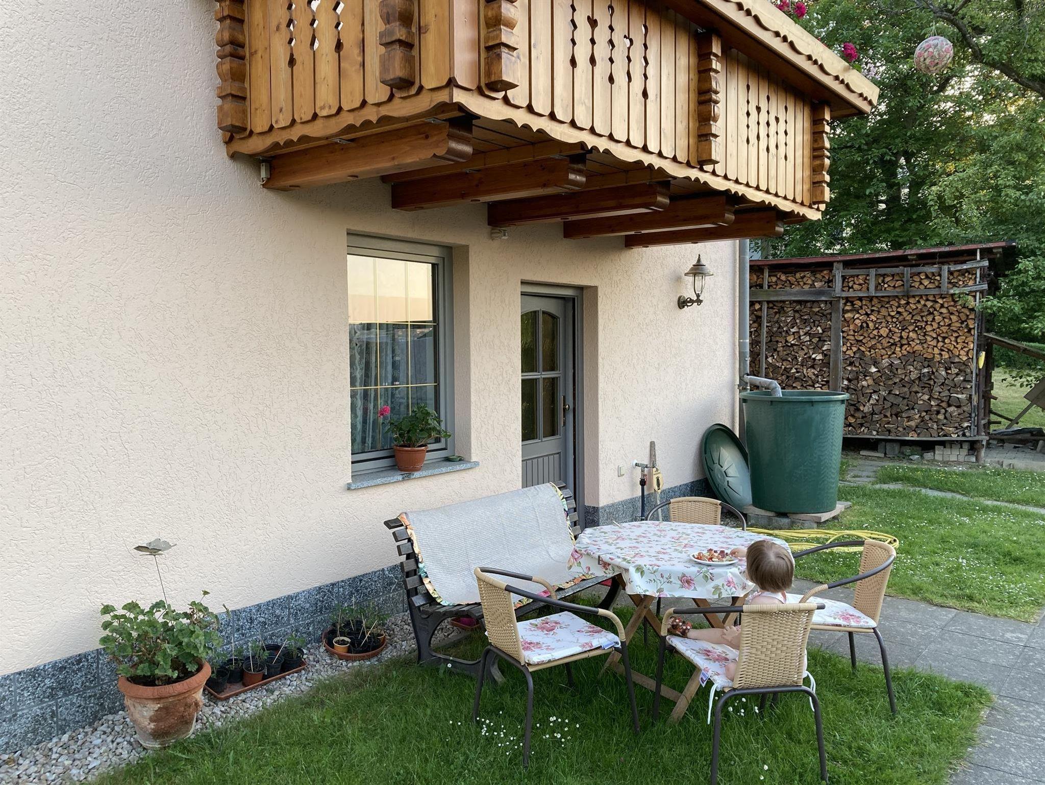 Ferienwohnung (Parterre) für max. 4 Pers. mit Wohnzimmer (TV, Esstisch, Schlafsofa/Aufbettung 2 Pers.), Schlafzimmer (Doppelbett), kleiner Küche (komplett ausgestattet, Esstisch) und Bad (Du/WC, Föhn). Der Sitzplatz im Garten kann genutzt werden. Im Garten Spielhaus und Sandkasten für Kinder vorhanden. Haustiere möglich. Frühstück auf Anfrage möglich.