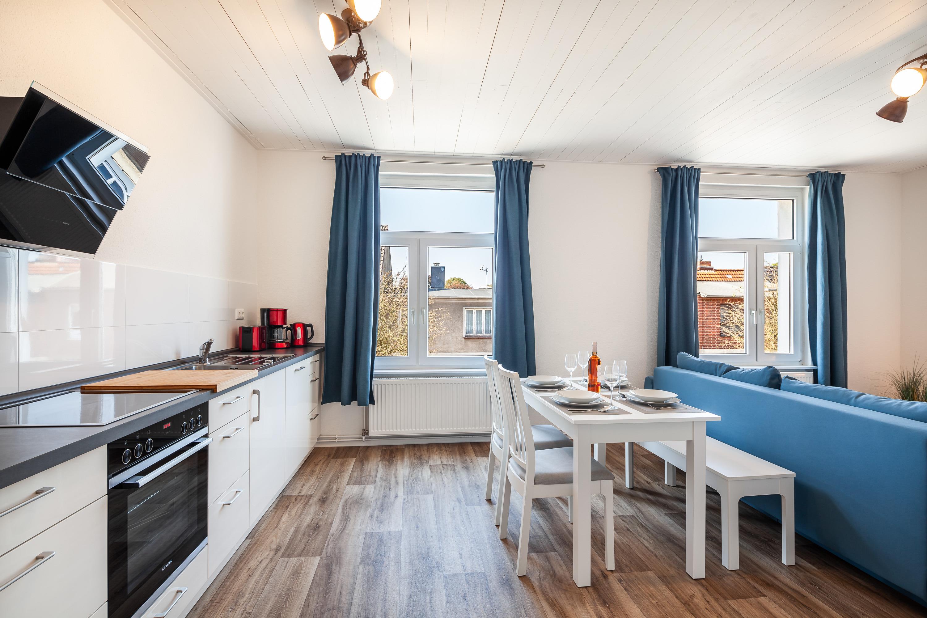 Die Ferienwohnung 02 befindet sich in der 1.Etage und ist für maximal 3 Personen ausgestattet, die Wohnfläche beträgt 55m². Die Ferienwohnung ist mit einer Schlafcouch und einer offenen großen ,sehr hochwertigen Küche ausgestattet.Die Küche verfügt über ein Geschirrspüler ,E-Herd,Toaster und einer Filterkaffeemaschine.