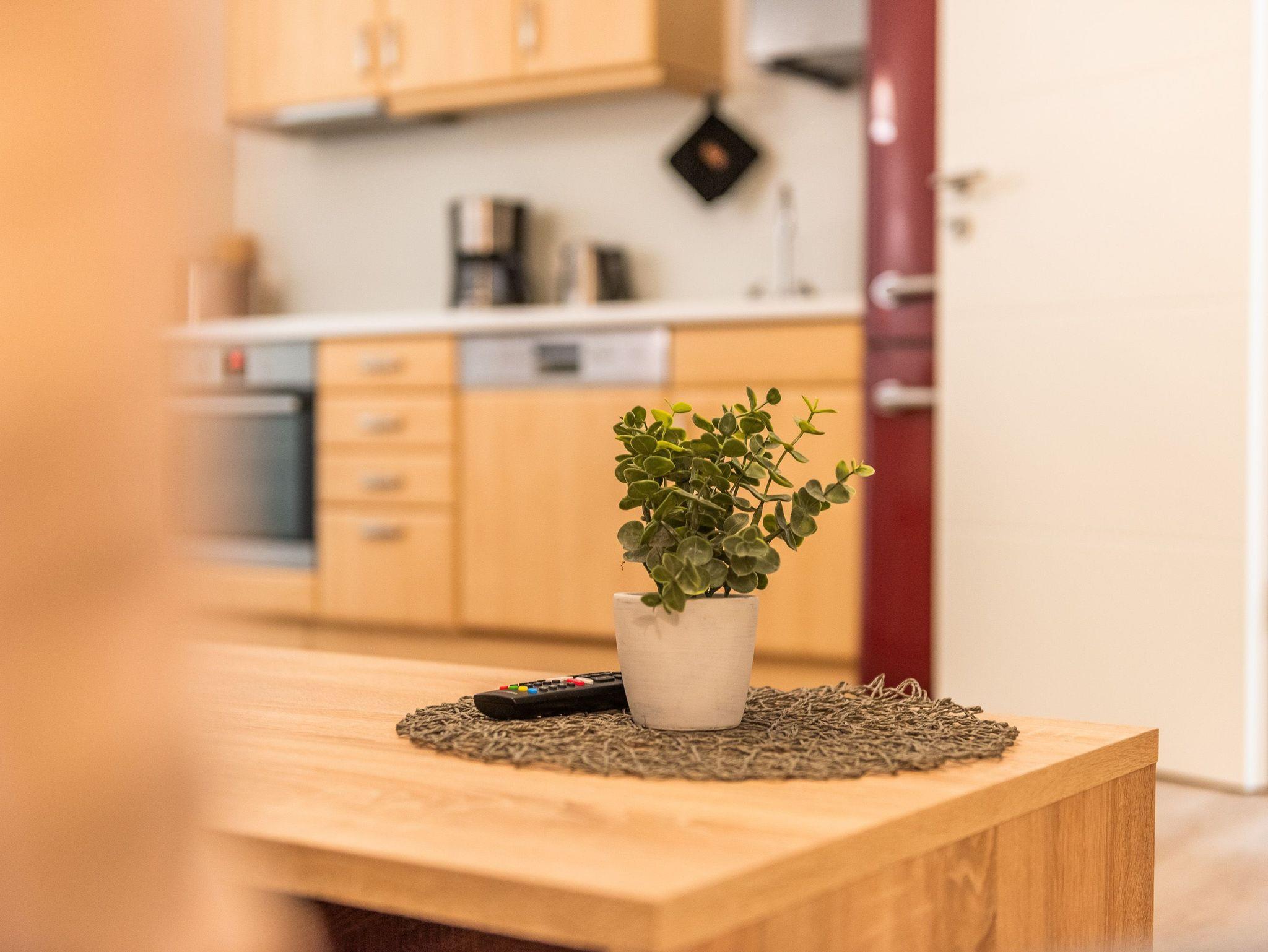 Neben einer gut ausgestatteten Einbauküche steht ein Backofen mit Ceranfeld, Kaffeemaschine, Toaster, Wasserkocher sowie ein Kühlschrank zur Verfügung.