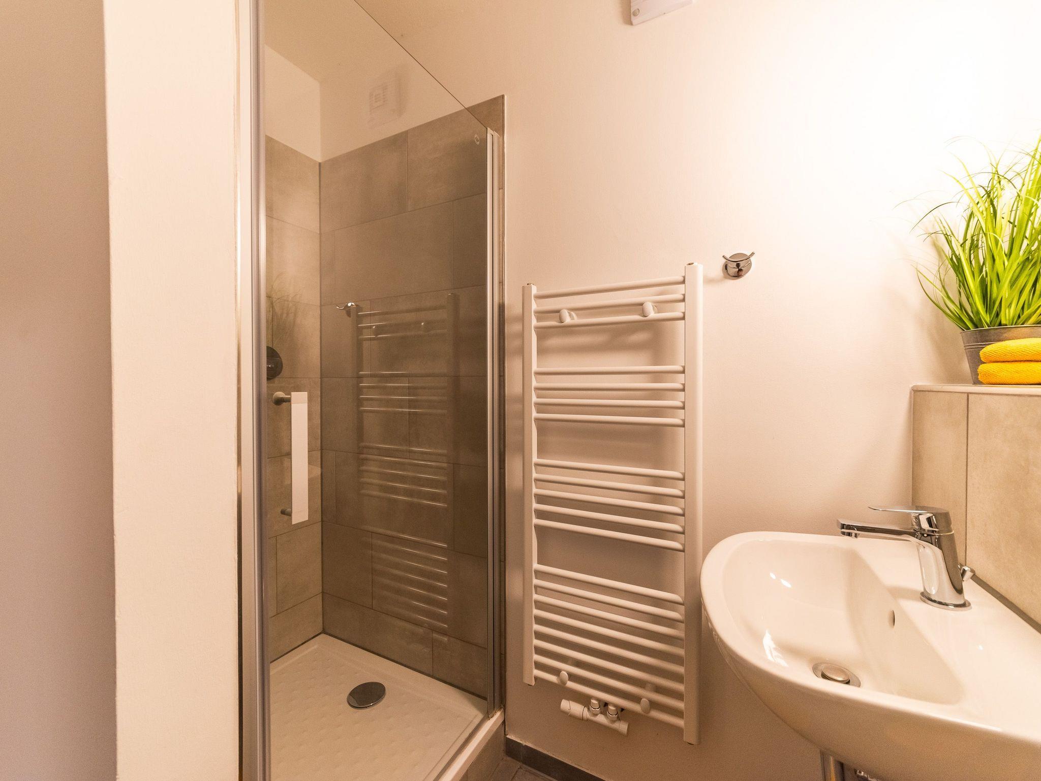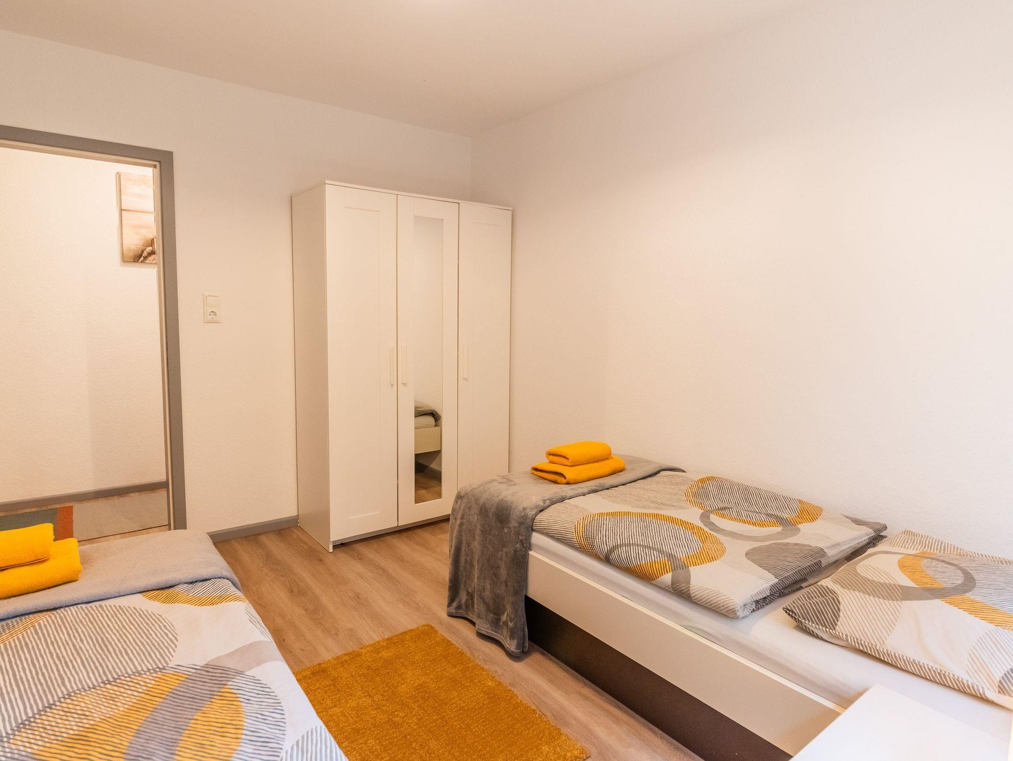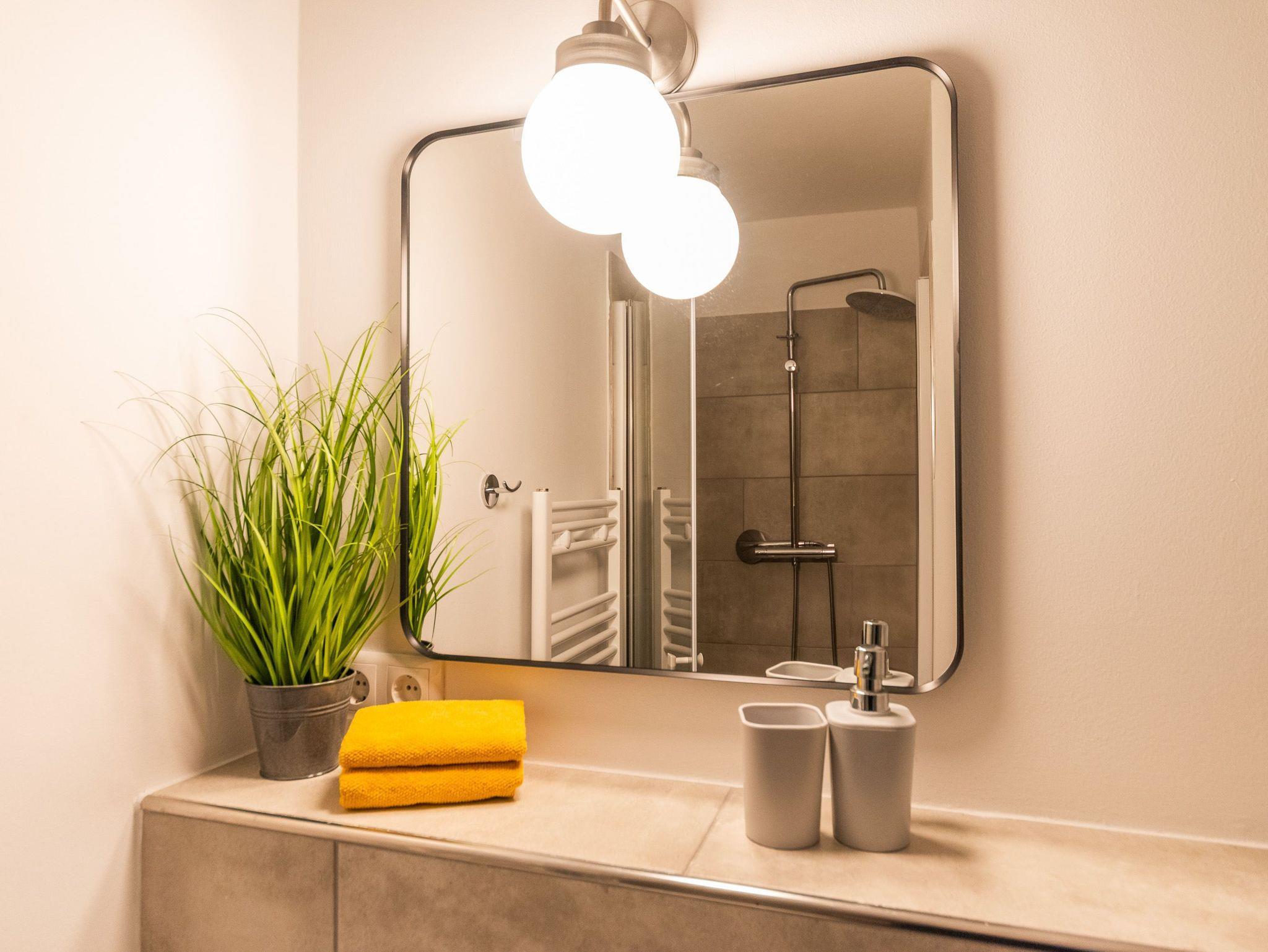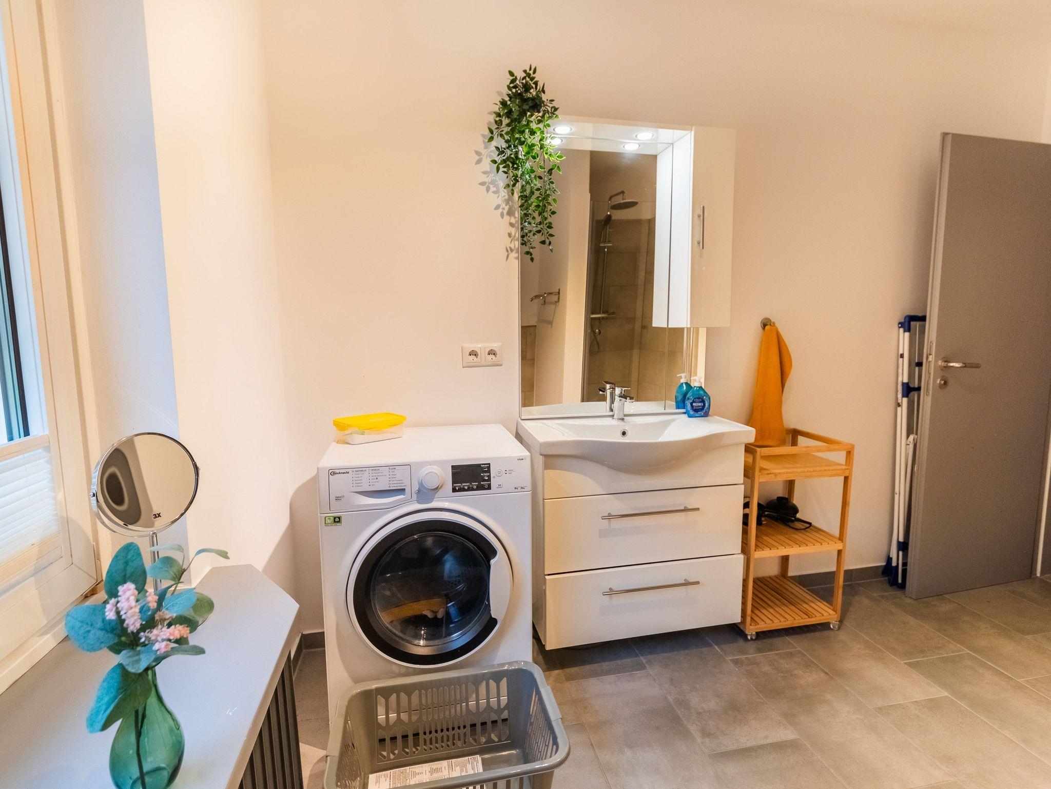 Im Untergeschoss befindet sich ein großes Schlafzimmer mit Doppelbett (180x200). Dort ist genügend Platz um ggf. ein Babyreisebett unter zu bringen. Außerdem sind auf dieser Etage zwei Badezimmer mit je einer Dusche ausgestattet. Selbstverständlich bietet diese Wohnung eine Waschmaschine sowie einen Trockner.