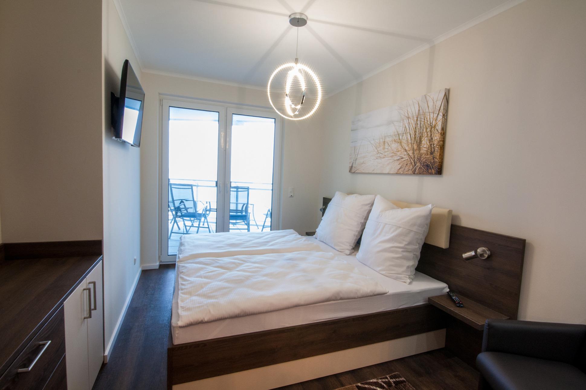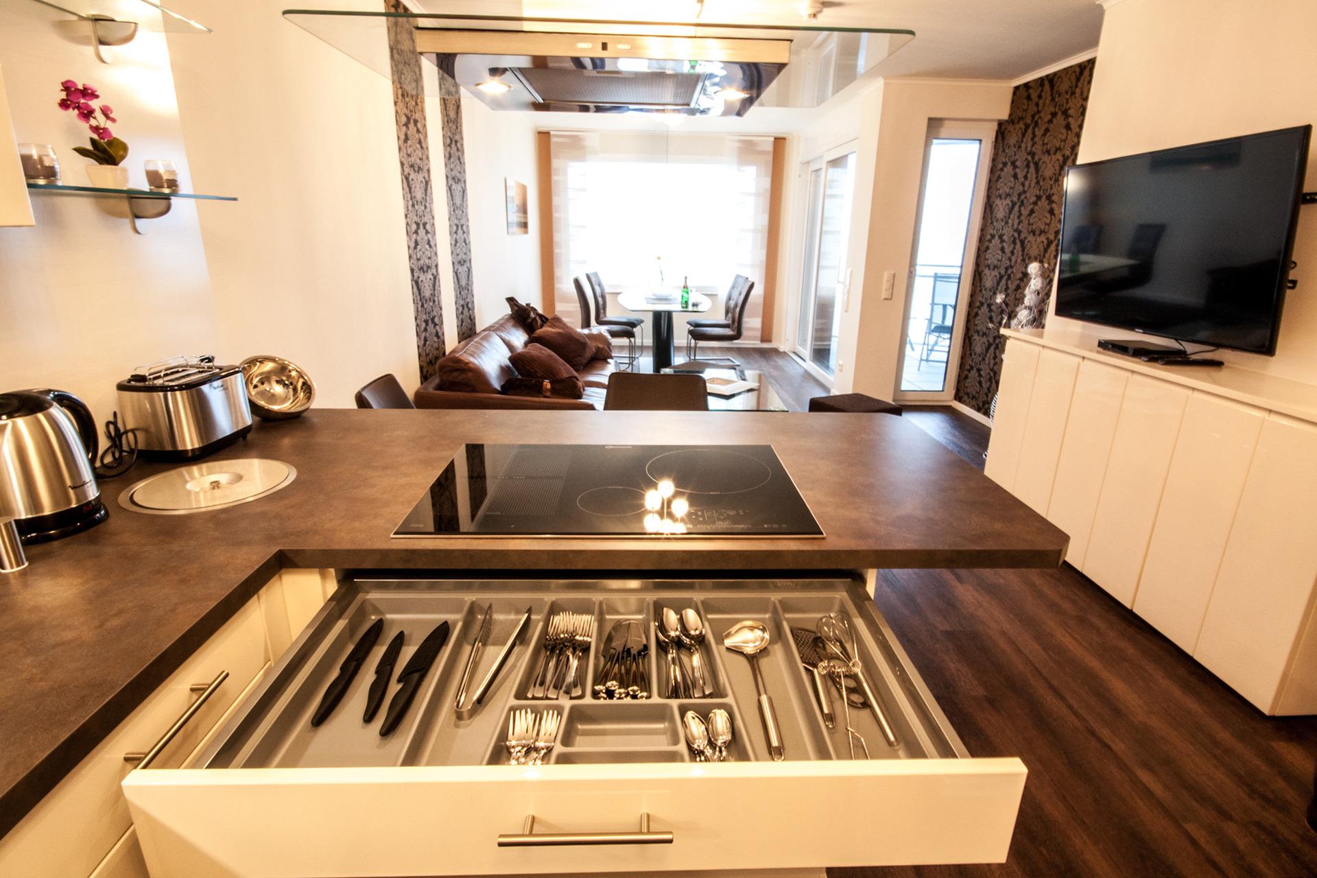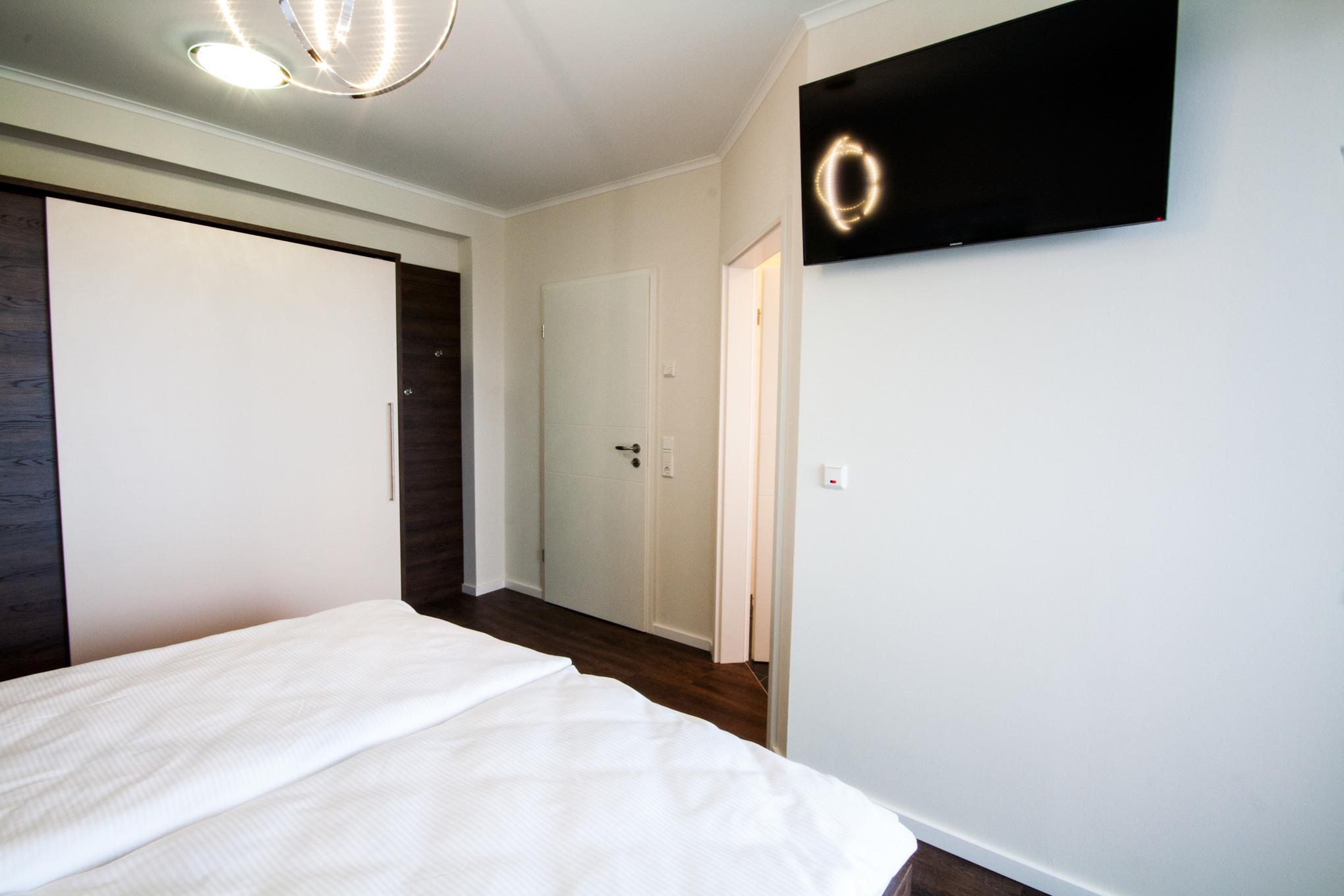 2 Schlafzimmer mit jeweils einem Doppelbett und TV, 1 Wohnzimmer mit Essplatz, moderne TV Anlage im Wohnzimmer, hochwertige Küche mit Induktionskochfeld + Backofen + Geschirrspüler und allem was zur Küche gehört, 1 Duschbad mit ebenerdiger Dusche und Tageslicht, 1 Duschbad, innenliegend, mit ebenerdiger Dusche, Fußbodenheizung in allen Räumen, 1 Abstellraum, 1 Balkon Richtung Norden mit Blick auf den Weltschifffahrtsweg, die Kugelbake und den Grünstrand, 1 Balkon Richtung Süd/West, Videosprechanlage, Rauchmelder in allen Räumen, 1 Garage am Haus mit Fernbedienung. Das Haus verfügt über einen Fahrstuhl.
