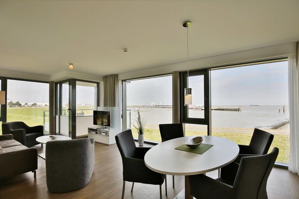Totaler Seeblick. Direkt an der Sehenswürdigkeit "Alte Liebe" erleben Sie einen der schönsten Ausblicke Cuxhavens. Schöne 3 Zi. Luxus-Wohnung über 85m², 1. Etage, großes Wohnzimmer mit dem Panoramablick und Balkon (nord/west), vollständig ausgestattete Küchenzeile, 2 Schlafzi. mit Doppelbetten und Außenjalousien, 2xTV, DVD, Radio/CD, kostenloses W-Lan-Internet, 1xDu/WC, 1x Gäste-WC, reservierter Außenstellplatz, freie Saunanutzung, Nichtraucher, keine Haustiere.