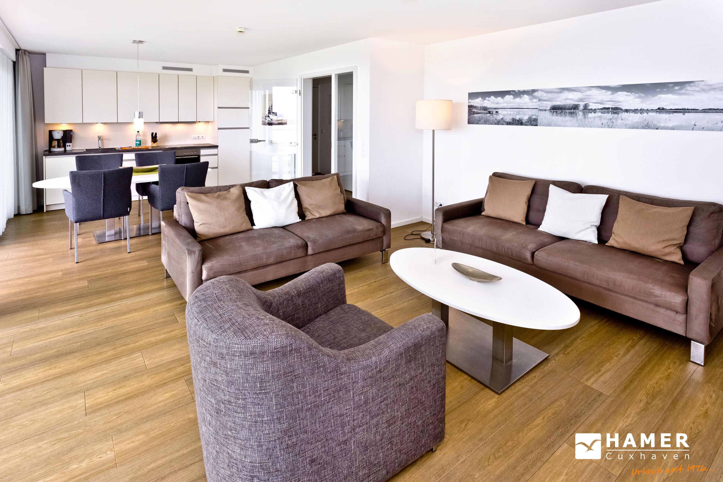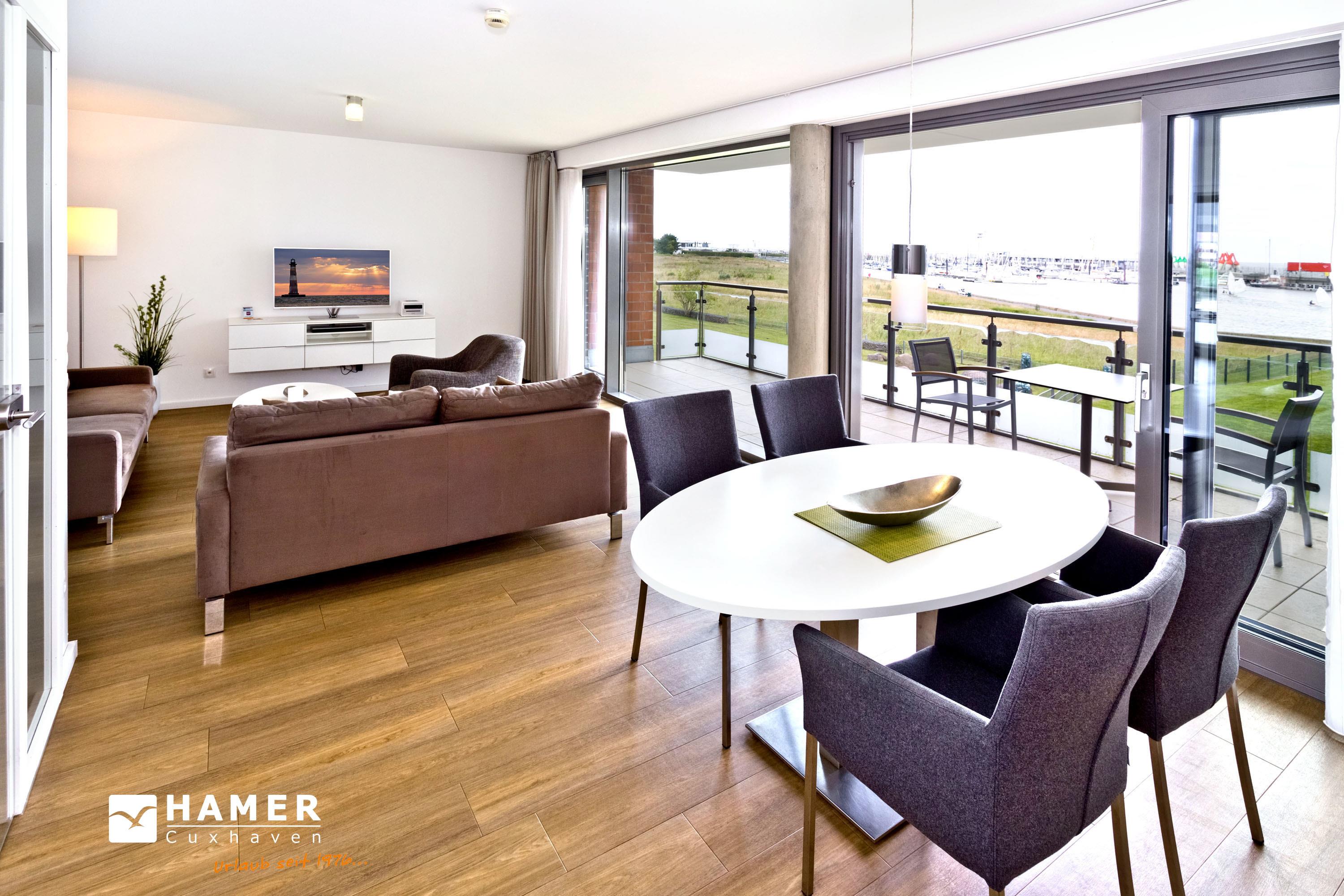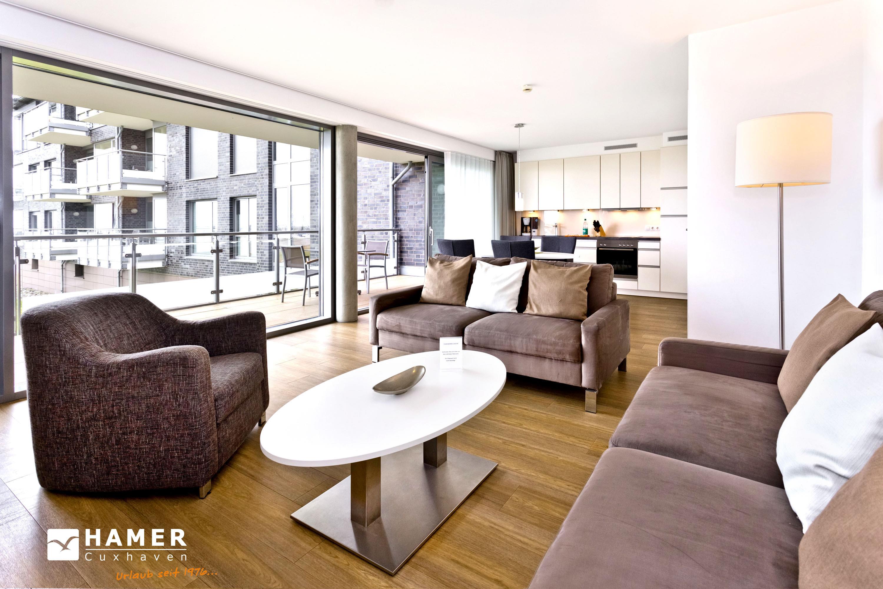 Seesicht vom Feinsten. Komfortable 3 Zi. Luxus-Wohnung über 91m², 1. Etage, großzügiges Wohnzimmer mit großem Balkon (nord), ein weiterer Balkon zur Südseite an den Schlafzimmern, vollständig ausgestattete Küchenzeile, 2 Schlafzimmer mit Doppelbetten und Außenjalousien, 2xTV, DVD, Radio/CD, kostenloses W-Lan-Internet, 1xDu/WC, 1x Gäste-WC, reservierter Außenstellplatz, freie Saunanutzung, Nichtraucher, keine Haustiere.